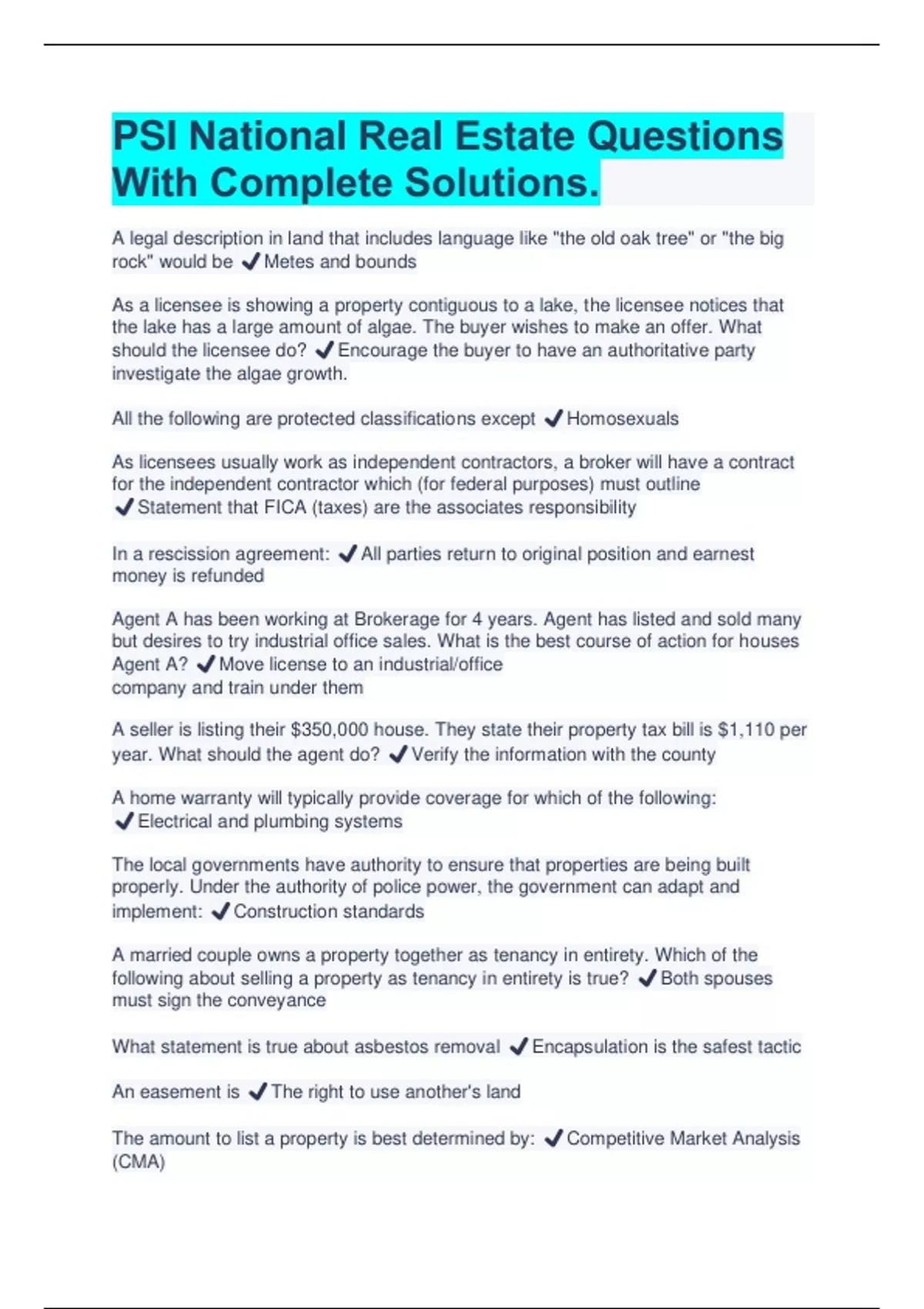 PSI National Real Estate Questions With Complete Solutions | Latest 2023/2024 A legal description in land that includes language like "the old oak tree" or "the big rock" would be ️Metes and bounds As a licensee is showing a property contiguous to a lake, the licensee notices that the lake has a large amount of algae. The buyer wishes to make an offer. What should the licensee do? ️Encourage the buyer to have an authoritative party investigate the algae growth. All the following are protected classifications except ️Homosexuals As licensees usually work as independent contractors, a broker will have a contract for the independent contractor which (for federal purposes) must outline ️Statement that FICA (taxes) are the associates responsibility In a rescission agreement: ️All parties return to original position and earnest money is refunded Agent A has been working at Brokerage for 4 years. Agent has listed and sold many but desires to try industrial office sales. What is the best course of action for houses Agent A? ️Move license to an industrial/office company and train under them A seller is listing their $350,000 house. They state their property tax bill is $1,110 per year. What should the agent do? ️Verify the information with the county A home warranty will typically provide coverage for which of the following: ️Electrical and plumbing systems The local governments have authority to ensure that properties are being built properly. Under the authority of police power, the government can adapt and implement: ️Construction standards A married couple owns a property together as tenancy in entirety. Which of the following about selling a property as tenancy in entirety is true? ️Both spouses must sign the conveyance What statement is true about asbestos removal ️Encapsulation is the safest tactic An easement is ️The right to use another's land The amount to list a property is best determined by: ️Competitive Market Analysis (CMA)