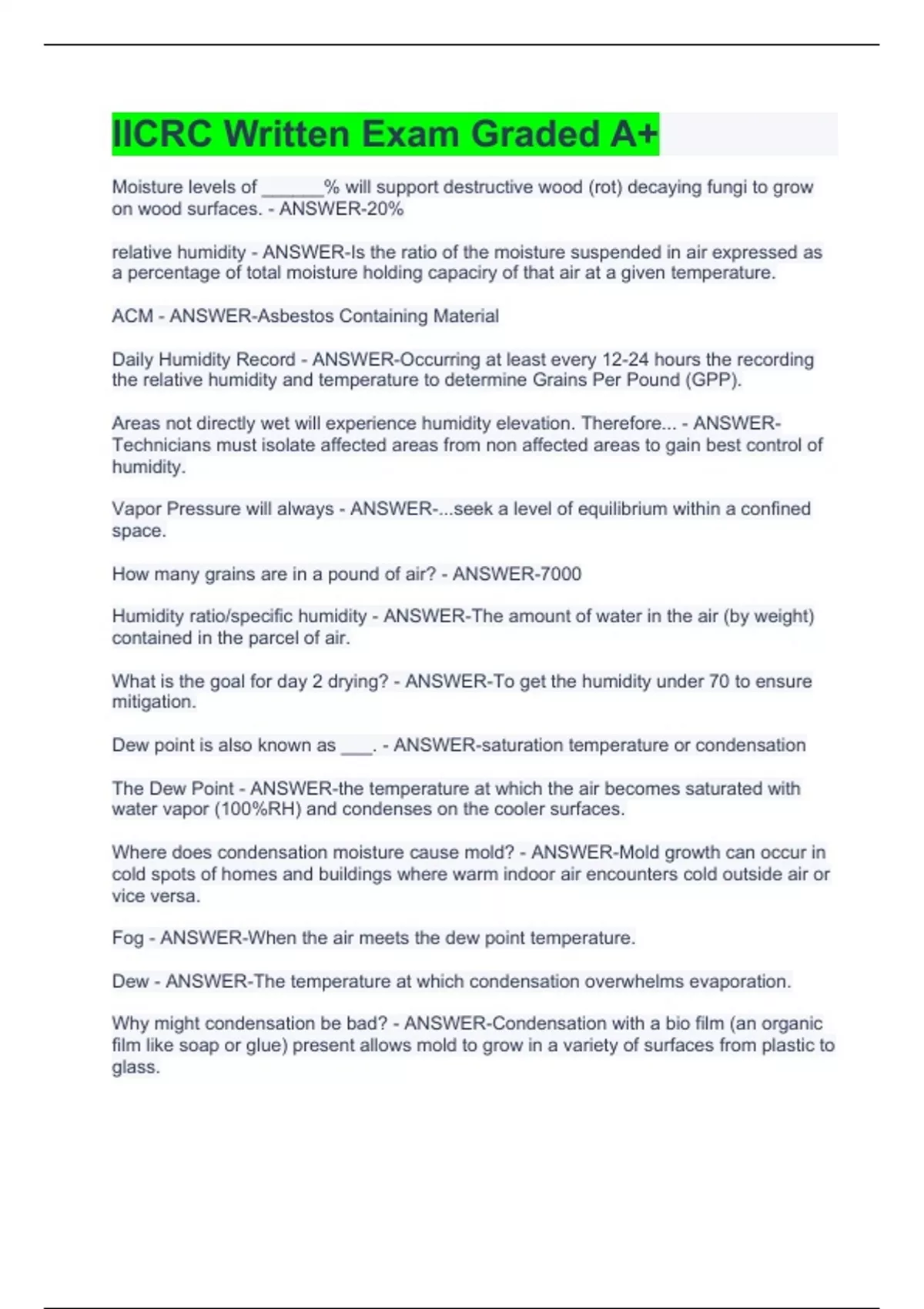 Moisture levels of ______% will support destructive wood (rot) decaying fungi to grow on wood surfaces. - ANSWER-20% relative humidity - ANSWER-Is the ratio of the moisture suspended in air expressed as a percentage of total moisture holding capaciry of that air at a given temperature. ACM - ANSWER-Asbestos Containing Material Daily Humidity Record - ANSWER-Occurring at least every 12-24 hours the recording the relative humidity and temperature to determine Grains Per Pound (GPP). Areas not directly wet will experience humidity elevation. Therefore... - ANSWER-Technicians must isolate affected areas from non affected areas to gain best control of humidity. Vapor Pressure will always - ANSWER-...seek a level of equilibrium within a confined space. How many grains are in a pound of air? - ANSWER-7000 Humidity ratio/specific humidity - ANSWER-The amount of water in the air (by weight) contained in the parcel of air. What is the goal for day 2 drying? - ANSWER-To get the humidity under 70 to ensure mitigation. Dew point is also known as ___. - ANSWER-saturation temperature or condensation The Dew Point - ANSWER-the temperature at which the air becomes saturated with water vapor (100%RH) and condenses on the cooler surfaces. Where does condensation moisture cause mold? - ANSWER-Mold growth can occur in cold spots of homes and buildings where warm indoor air encounters cold outside air or vice versa. Fog - ANSWER-When the air meets the dew point temperature. Dew - ANSWER-The temperature at which condensation overwhelms evaporation. Why might condensation be bad? - ANSWER-Condensation with a bio film (an organic film like soap or glue) present allows mold to grow in a variety of surfaces from plastic to glass.