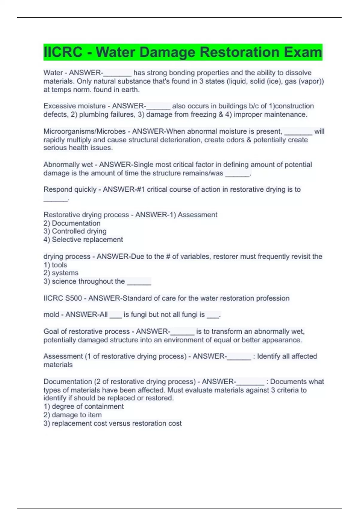 Water - ANSWER-_______ has strong bonding properties and the ability to dissolve materials. Only natural substance that's found in 3 states (liquid, solid (ice), gas (vapor)) at temps norm. found in earth. Excessive moisture - ANSWER-______ also occurs in buildings b/c of 1)construction defects, 2) plumbing failures, 3) damage from freezing & 4) improper maintenance. Microorganisms/Microbes - ANSWER-When abnormal moisture is present, _______ will rapidly multiply and cause structural deterioration, create odors & potentially create serious health issues. Abnormally wet - ANSWER-Single most critical factor in defining amount of potential damage is the amount of time the structure remains/was ______. Respond quickly - ANSWER-#1 critical course of action in restorative drying is to ______. Restorative drying process - ANSWER-1) Assessment 2) Documentation 3) Controlled drying 4) Selective replacement drying process - ANSWER-Due to the # of variables, restorer must frequently revisit the 1) tools 2) systems 3) science throughout the ______ IICRC S500 - ANSWER-Standard of care for the water restoration profession mold - ANSWER-All ___ is fungi but not all fungi is ___. Goal of restorative process - ANSWER-______ is to transform an abnormally wet, potentially damaged structure into an environment of equal or better appearance. Assessment (1 of restorative drying process) - ANSWER-______ : Identify all affected materials Documentation (2 of restorative drying process) - ANSWER-_______ : Documents what types of materials have been affected. Must evaluate materials against 3 criteria to identify if should be replaced or restored. 1) degree of containment 2) damage to item 3) replacement cost versus restoration cost
