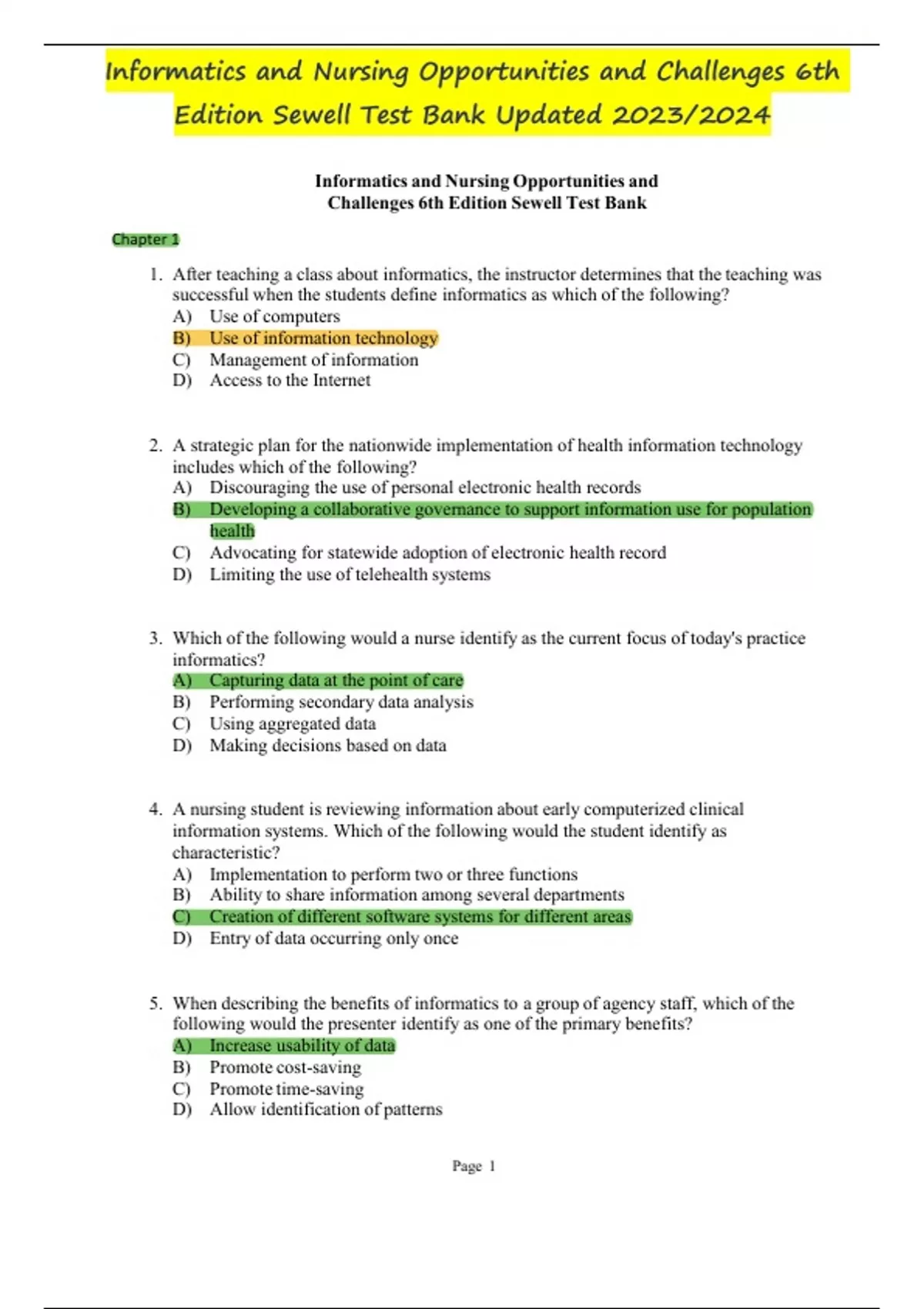 Informatics and Nursing Opportunities and Challenges 6th Edition Sewell Test Bank Updated 2023/2024 1.After teaching a class about informatics, the instructor determines that the teaching was successful when the students define informatics as which of the following? A)Use of computers B)Use of information technology C)Management of information D)Access to the Internet 2.A strategic plan for the nationwide implementation of health information technology includes which of the following? A)Discouraging the use of personal electronic health records B)Developing a collaborative governance to support information use for population health C)Advocating for statewide adoption of electronic health record D)Limiting the use of telehealth systems 3.Which of the following would a nurse identify as the current focus of today's practice informatics? A)Capturing data at the point of care B)Performing secondary data analysis C)Using aggregated data D)Making decisions based on data