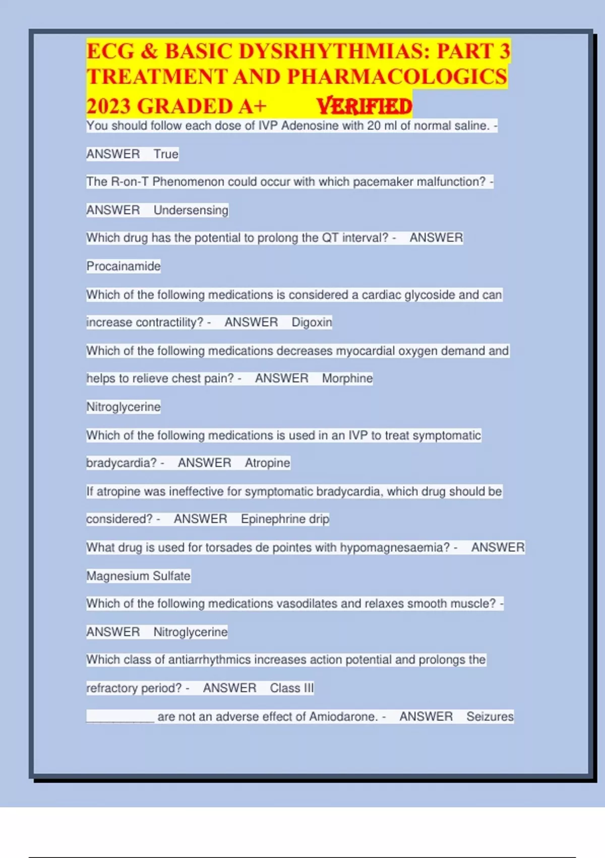 You should follow each dose of IVP Adenosine with 20 ml of normal saline. - ANSWER True The R-on-T Phenomenon could occur with which pacemaker malfunction? - ANSWER Undersensing Which drug has the potential to prolong the QT interval? - ANSWER Procainamide Which of the following medications is considered a cardiac glycoside and can increase contractility? - ANSWER Digoxin Which of the following medications decreases myocardial oxygen demand and helps to relieve chest pain? - ANSWER Morphine Nitroglycerine Which of the following medications is used in an IVP to treat symptomatic bradycardia? - ANSWER Atropine If atropine was ineffective for symptomatic bradycardia, which drug should be considered? - ANSWER Epinephrine drip What drug is used for torsades de pointes with hypomagnesaemia? - ANSWER Magnesium Sulfate Which of the following medications vasodilates and relaxes smooth muscle? - ANSWER Nitroglycerine Which class of antiarrhythmics increases action potential and prolongs the refractory period? - ANSWER Class III __________ are not an adverse effect of Amiodarone. - ANSWER