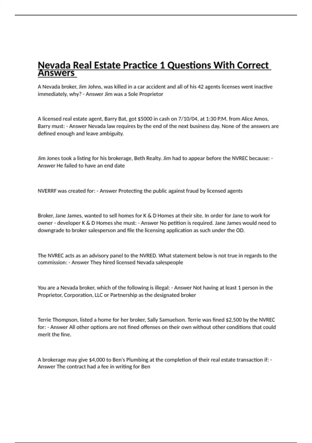 Nevada Real Estate Practice 1 Questions With Correct Answers