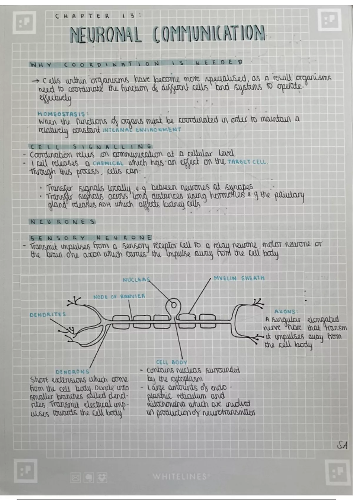 OCR A A level biology notes for chapter 13 neuronal communication. These detailed notes include everything you need to know about this chapter for the exam and helped me achieve an A grade at A level. (includes diagrams!!)