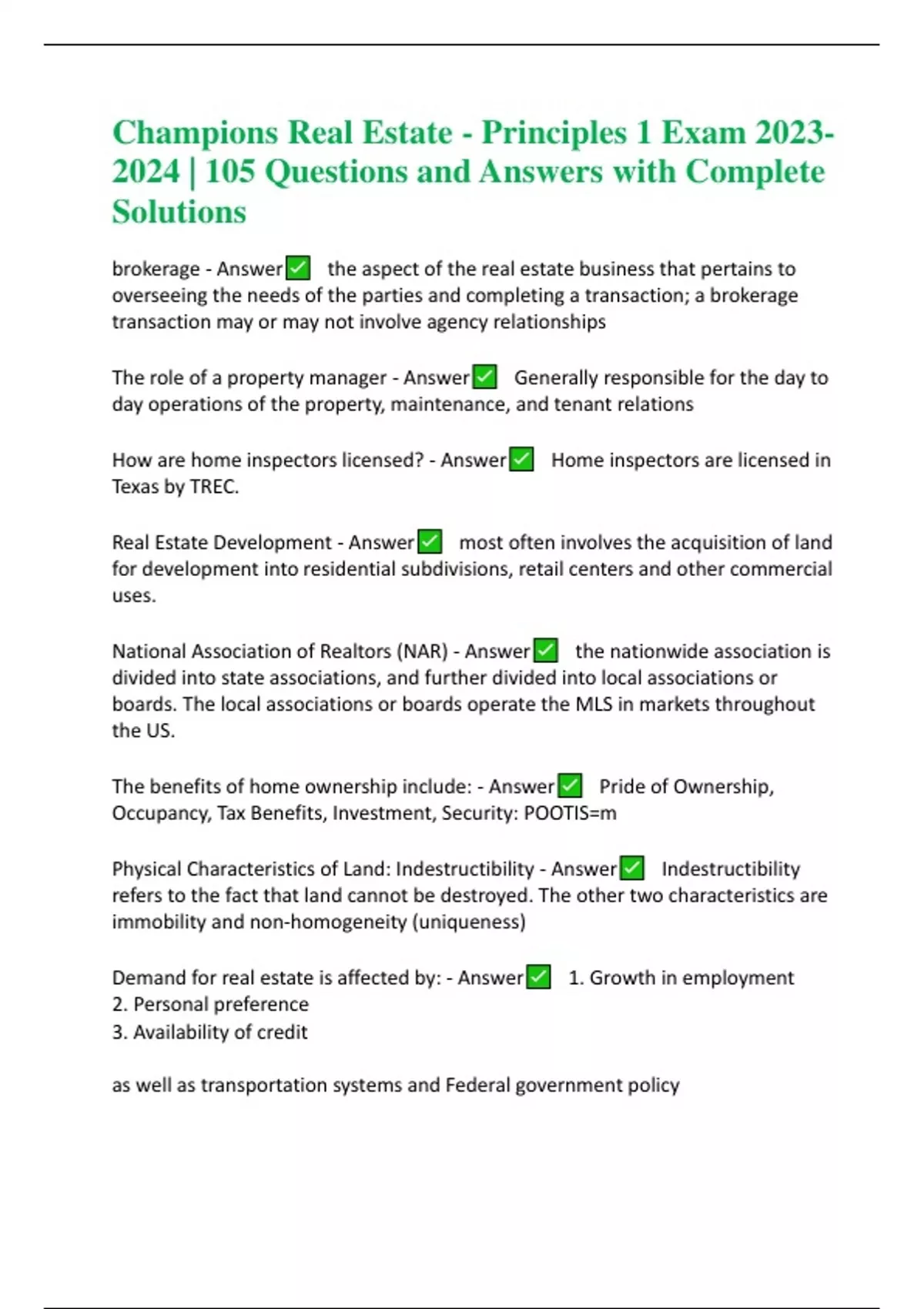 Champions Real Estate - Principles 1 Exam | 105 Questions and Answers with Complete Solutions