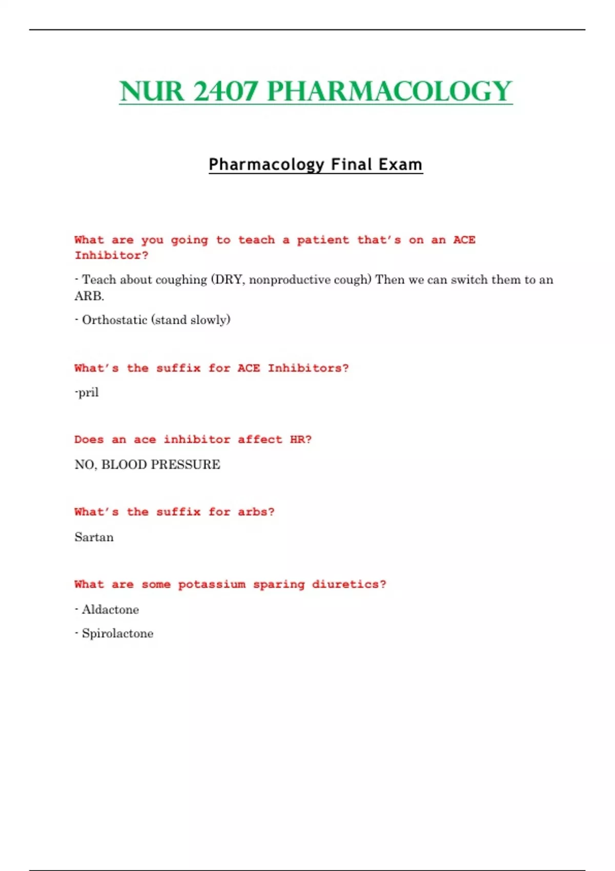 NUR 2407 Pharmacology Pharmacology Final Exam What are you going to teach a patient that’s on an ACE Inhibitor? - Teach about coughing (DRY, nonproductive cough) Then we can switch them to an ARB. - Orthostatic (stand slowly) What’s the suffix for ACE Inhibitors? -pril Does an ace inhibitor affect HR? NO, BLOOD PRESSURE What’s the suffix for arbs? Sartan What are some potassium sparing diuretics ? - Aldactone - Spirolactone Patient teaching for potassium sparing diuretics ? Teach them about - When they should take it (In the morning) - What should they monitor (Daily weight, Urine output except for an increase) - Take with meals Nursing interventions for nitroglycerin ? No Viagra , alcohol, sildenafil, NO MED that ends in afil. Will kill the pa tient. Nitroglycerin administration ? - 1st dose in 5 min then call 9 -11 - Then administer 2nd dose and wait 5 min - Then the third if still in pain What happens if a patient abuses the albuterol? Insomnia, n/v, palpitations (from tachycardia), tremor, anxiety . What is beclomethasone? Steroid Inhaler teaching Albuterol first, ipratropium second, then steroid . Steroids end in -sone