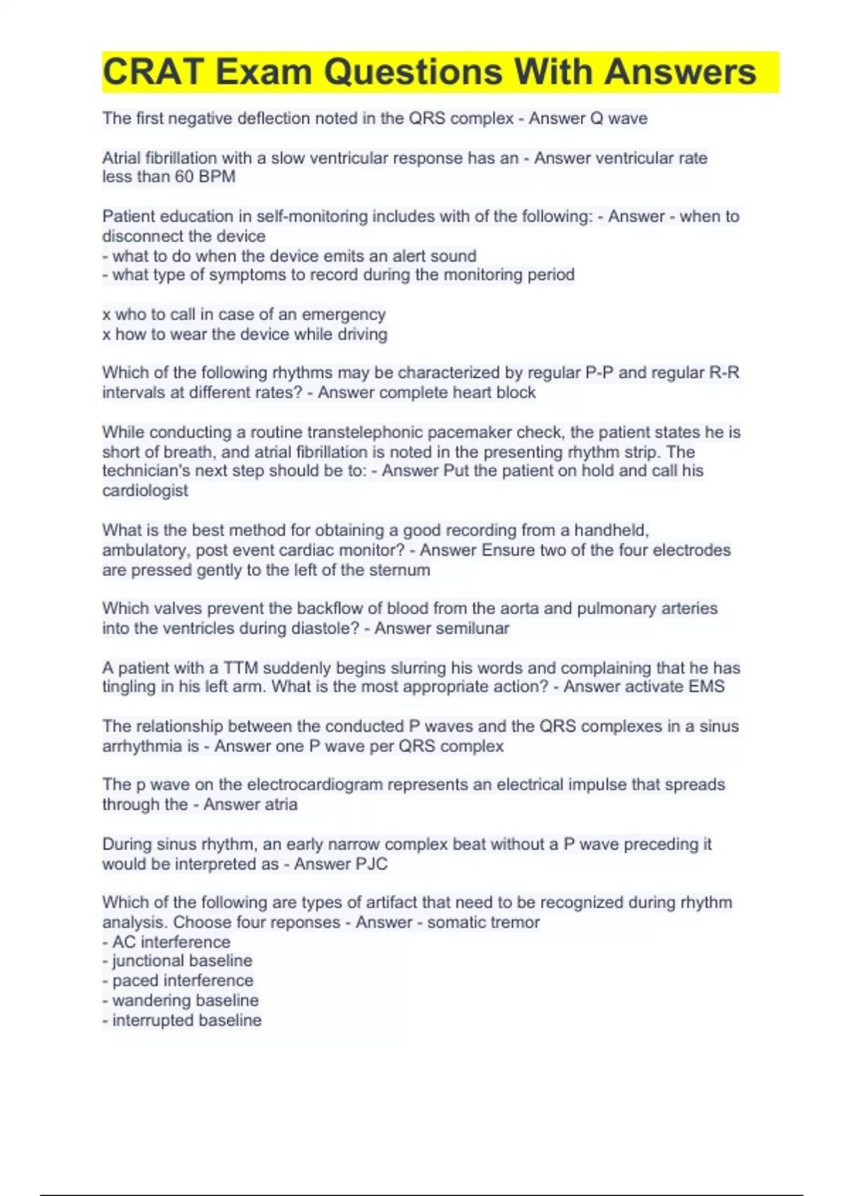 CRAT Exam Questions With Answers | Latest Update 2023/2024 (GRADED A+). Patient education in self-monitoring includes with of the following: - Answer - when to disconnect the device - what to do when the device emits an alert sound - what type of symptoms to record during the monitoring period x who to call in case of an emergency x how to wear the device while driving Which of the following rhythms may be characterized by regular P-P and regular R-R intervals at different rates? - Answer complete heart block While conducting a routine transtelephonic pacemaker check, the patient states he is short of breath, and atrial fibrillation is noted in the presenting rhythm strip. The technician's next step should be to: - Answer Put the patient on hold and call his cardiologist What is the best method for obtaining a good recording from a handheld, ambulatory, post event cardiac monitor? - Answer Ensure two of the four electrodes are pressed gently to the left of the sternum Which valves prevent the backflow of blood from the aorta and pulmonary arteries into the ventricles during diastole? - Answer semilunar A patient with a TTM suddenly begins slurring his words and complaining that he has tingling in his left arm. What is the most appropriate action? - Answer activate EMS The relationship between the conducted P waves and the QRS complexes in a sinus arrhythmia is - Answer one P wave per QRS complex The p wave on the electrocardiogram represents an electrical impulse that spreads through the - Answer atria During sinus rhythm, an early narrow complex beat without a P wave preceding it would be interpreted as - Answer PJC Which of the following are types of artifact that need to be recognized during rhythm analysis. Choose four reponses - Answer - somatic tremor - AC interference - junctional baseline - paced interference - wandering baseline - interrupted baseline CRAT exam already passed!! The patient requires a 30-day cardiac monitoring device. Which of the following items would be the least important education related to the patients self-monitoring? - Answer what type of cardiac monitoring device is in use In the absense of a release form, a patient's health information may be shared with the patient's ___ without committing a HIPAA violation - Answer physician Which of the following BEST describes idioventricular rhythm? - Answer heart rate 20-40 BPM, almost always regular, no P waves preceding a wide QRS Which of the following items would be considered standard instructions when placing a 24h monitoring device on a pateint in a clinical setting? - Answer - explain the importance of not getting the monitor wet - encourage teh patient to leave the monitor on the entire time - inform the patient of physical limitations while the monitor is worn First degree AV block is determined by teh measurement of the - Answer PR interval The normal gain setting for ECG acquisition is ___ mm/mV - Answer 10 The conduction system terminates with the - Answer Purkinje network Atrial fibrillation is best defined as - Answer chaotic, asynchronous electrical activity in atrial tissue What should be done when a patient reports that their demographic information is incorrect? - Answer Follow the organizational procedure and correct the error immediately What process is used to clean monitoring equipment between patient use - Answer Disinfecting Which of the following essential tools are required to begin remote cardiac device monitoring? - Answer - batteries - electrodes - adhesive tape - cardiac device An in-hospital tel
