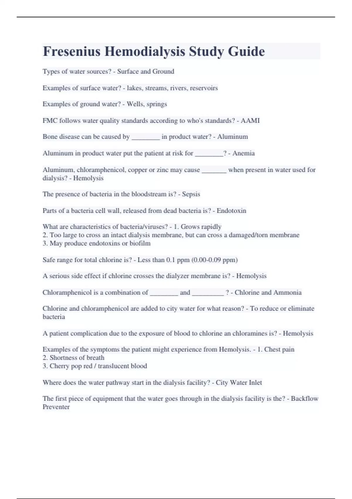 Fresenius Hemodialysis Study Guide Types of water sources? - Surface and Ground Examples of surface water? - lakes, streams, rivers, reservoirs Examples of ground water? - Wells, springs FMC follows water quality standards according to who's standards? - AAMI Bone disease can be caused by ________ in product water? - Aluminum Aluminum in product water put the patient at risk for ________? - Anemia Aluminum, chloramphenicol, copper or zinc may cause _______ when present in water used for dialysis? - Hemolysis The presence of bacteria in the bloodstream is? - Sepsis Parts of a bacteria cell wall, released from dead bacteria is? - Endotoxin What are characteristics of bacteria/viruses? - 1. Grows rapidly 2. Too large to cross an intact dialysis membrane, but can cross a damaged/torn membrane 3. May produce endotoxins or biofilm Safe range for total chlorine is? - Less than 0.1 ppm (0.00-0.09 ppm) A serious side effect if chlorine crosses the dialyzer membrane is? - Hemolysis Chloramphenicol is a combination of ________ and _________ ? - Chlorine and Ammonia Chlorine and chloramphenicol are added to city water for what reason? - To reduce or eliminate bacteria A patient complication due to the exposure of blood to chlorine an chloramines is? - Hemolysis Examples of the symptoms the patient might experience from Hemolysis. - 1. Chest pain 2. Shortness of breath 3. Cherry pop red / translucent blood Where does the water pathway start in the dialysis facility? - City Water Inlet The first piece of equipment that the water goes through in the dialysis facility is the? - Backflow Preventer What is the function of the backflow preventer? - Prevents water from flowing back into the city's water suppl. The recommended water temperature for ideal RO operation is? - 77 degrees F What is the function of the water booster pump? - Boosts incoming city water pressure What is the function of the Captive Air Tank (bladder tank)? - Help maintain a minimum pressure What is the function of the Chemical Feed pump? - Help adjust the pH level of the water What is the function of the Sediment Filters? - Removes larger particles from the incoming water What is the function of the multimedia filter? - Removes particles 10 microns in size or larger What is the size of particulate matter removed by the multimedia filter? - 10 What is the function of the Carbon Filter/Tank? - To remove chlorine and Chloramines and other organic materials. Carbon filters remove chlorine and chloramines by the process of? - Adsorbtion What is the "Empty Bed Contact Time?" - The length of time that the water is exposed to carbon AAMI requires a minimum EBCT of __ minutes, FMC requires a minimum EBCT of __ minutes for new water treatment systems. - 10, 12 RPC Ultra-Low Total Chlorine test strips are used to test for? - Total Chlorine in the water after GAC #1 and Post RO. When and at what frequency is routine total chlorine testing performed per FMS policy? - Prior to the initiation of treatment and at least every 4 hours. The reverse osmosis (RO) machine runs for __ minutes before performing any total chlorine testing. - 15 Total chlorine testing for a central water system must be performed and documented by __ qualified staff members. - 2 A sample container is always rinsed __ times before a sample is collected for testing. - 3 ___ ml is the correct amount of water to collect for total chlorine testing when using RPC Ultra-Low Total Chlorine test strips - 100 How long is the RPC Ultra-Low Total Chlorine test stripe immersed in the sample? - 60 seconds If a chlorine breakthrough occurs post GAC (Carbon) Filter #1, what are the several steps that are taken to ensure patients are safe from harm? - 1. Place all machines in bypass 2. Repeat test (optional) 3. Immediately test after GAC#2/Carbon Tank#2 4. If results are less than 0.1, notify the CM, MD, and ATOM/BMT If total chlorine testing after the second carbon tank shows results above the action limit, what action is immediately taken? - Immediately stop treatments _______ and _______ are removed from water by the softener by the process of ion exchange? - Calcium and Magnesium Water hardness is measured in parts per million (PPM). The FMS acceptable limit for water hardness post softener is __ PPM. Normally, there are __ water hardness tests done daily. - 10, 2 What do hardness strips test for? - Calcium and magnesium The RO must run for how long prior to testing water? - 15 minutes. What is "product water" ? - Water exiting the RO that meets the AAMI standards for water to be used for dialysis. RO performance is measured by what? - Percent rejection. The full calibration of the TDS meter is required how often? - Weekly UV light is a form of? - Invisible Radiation UV lights are effective when they have a wave length of ___ nanometers - 254 The low level alarm on the holding tank must be set (or on) when? - Always Where are the ultrafiltration located in the water treatment system? - In the loop What method of water treatment component is used during RO failure and is part of the "Alternate Water Supply Plan"? - Demonization Tanks Piping within the water treatment distribution lop is made of what material? - PVC, Stainless Steel, PEX. Teflon What causes a progenitor reaction in patients? - Exposure to bacteria and endotoxins Watch at are some of the symptoms of a pyrogens can reaction? - 1. Fever and chills 2. Nausea and vomiting 3. Hypotension CFU is an abbreviation for? - Colony Forming Unit The FMS action level for bacteria in product water exiting the RO is __ cfu/ml - 20 The FMS action level for bacteria for water in the tank, piping and distribution loop is __ cfu/ml - 20 The FMS action level for Endotoxin in product water exiting the RO is __ EU/ml - 0.125 The FMS action level for Endotoxin for water in the tank, piping and distribution loop is __ EU/ml - 0.125 Routine testing for bacteria and Endotoxin should take place how often? - Monthly What is the frequency of routine holding