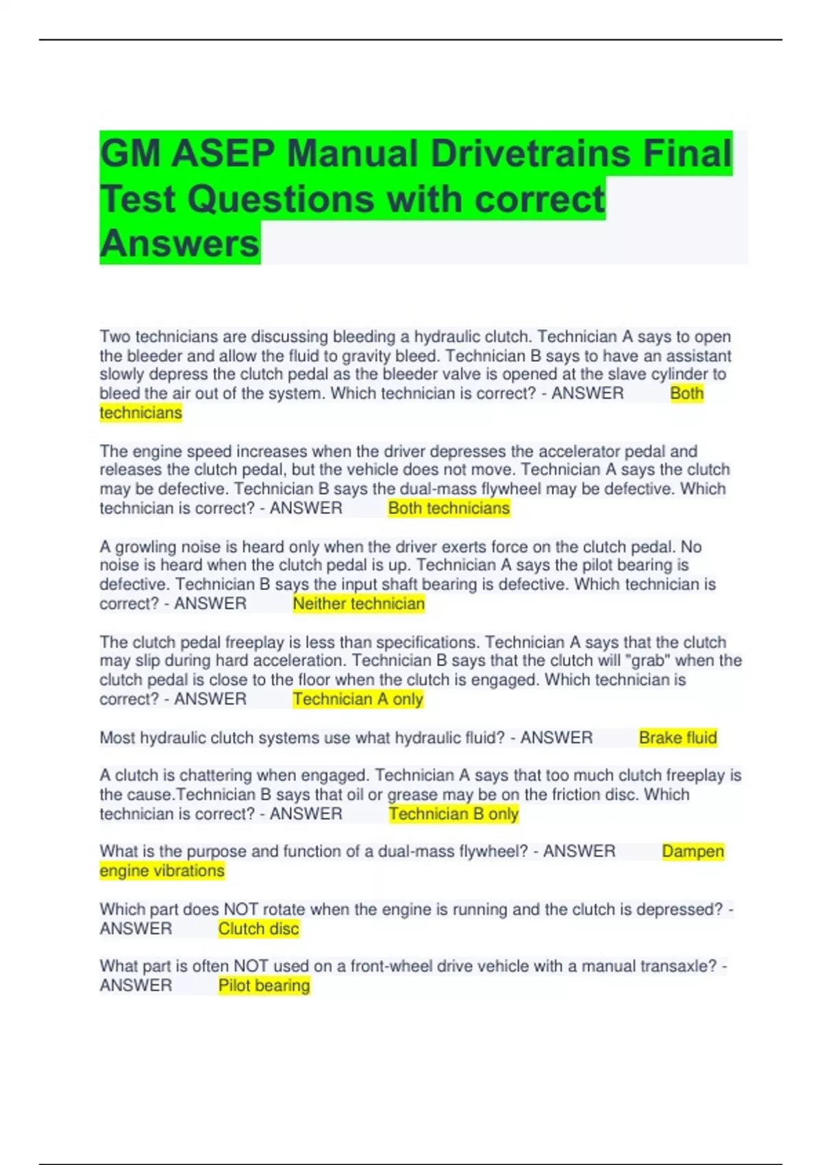 GM ASEP Manual Drivetrains Final Test Questions with correct Answers Two technicians are discussing bleeding a hydraulic clutch. Technician A says to open the bleeder and allow the fluid to gravity bleed. Technician B says to have an assistant slowly depress the clutch pedal as the bleeder valve is opened at the slave cylinder to bleed the air out of the system. Which technician is correct? - ANSWER Both technicians The engine speed increases when the driver depresses the accelerator pedal and releases the clutch pedal, but the vehicle does not move. Technician A says the clutch may be defective. Technician B says the dual-mass flywheel may be defective. Which technician is correct? - ANSWER Both technicians A growling noise is heard only when the driver exerts force on the clutch pedal. No noise is heard when the clutch pedal is up. Technician A says the pilot bearing is defective. Technician B says the input shaft bearing is defective. Which technician is correct? - ANSWER Neither technician The clutch pedal freeplay is less than specifications. Technician A says that the clutch may slip during hard acceleration. Technician B says that the clutch will "grab" when the clutch pedal is close to the floor when the clutch is engaged. Which technician is correct? - ANSWER Technician A only Most hydraulic clutch systems use what hydraulic fluid? - ANSWER Brake fluid A clutch is chattering when engaged. Technician A says that too much clutch freeplay is the cause.Technician B says that oil or grease may be on the friction disc. Which technician is correct? - ANSWER Technician B only What is the purpose and function of a dual-mass flywheel? - ANSWER Dampen engine vibrations Which part does NOT rotate when the engine is running and the clutch is depressed? - ANSWER Clutch disc What part is often NOT used on a front-wheel drive vehicle with a manual transaxle? - ANSWER Pilot bearing What should be done to see if a clutch is slipping? - ANSWER Rapidly accelerate the vehicle in first or second gear and rapidly shift the transmission into a higher gear. A manual transmission is difficult to shift or get into gear, especially reverse. Technician A says that the clutch may not be fully releasing. Technician B says that too much clutch pedal freeplay could be the cause. Which technician is correct? - ANSWER Both technicians Technician A says that too much clutch pedal freeplay can cause the clutch to slip during acceleration. Technician B says that too little clutch pedal freeplay can cause the clutch to slip. Which technician is correct? - ANSWER Technician B only What needs to be done before attaching the pressure plate to the flywheel? - ANSWER Align the clutch disc to the pilot bearing