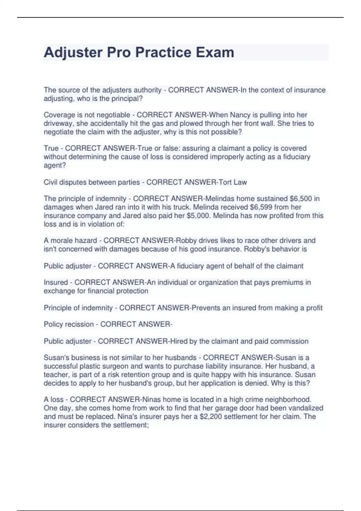Adjuster Pro Practice Exam The source of the adjusters authority - CORRECT ANSWER-In the context of insurance adjusting, who is the principal? Coverage is not negotiable - CORRECT ANSWER-When Nancy is pulling into her driveway, she accidentally hit the gas and plowed through her front wall. She tries to negotiate the claim with the adjuster, why is this not possible? True - CORRECT ANSWER-True or false: assuring a claimant a policy is covered without determining the cause of loss is considered improperly acting as a fiduciary agent? Civil disputes between parties - CORRECT ANSWER-Tort Law The principle of indemnity - CORRECT ANSWER-Melindas home sustained $6,500 in damages when Jared ran into it with his truck. Melinda received $6,599 from her insurance company and Jared also paid her $5,000. Melinda has now profited from this loss and is in violation of: A morale hazard - CORRECT ANSWER-Robby drives likes to race other drivers and isn't concerned with damages because of his good insurance. Robby's behavior is Public adjuster - CORRECT ANSWER-A fiduciary agent of behalf of the claimant Insured - CORRECT ANSWER-An individual or organization that pays premiums in exchange for financial protection Principle of indemnity - CORRECT ANSWER-Prevents an insured from making a profit Policy recission - CORRECT ANSWERPublic adjuster - CORRECT ANSWER-Hired by the claimant and paid commission Susan's business is not similar to her husbands - CORRECT ANSWER-Susan is a successful plastic surgeon and wants to purchase liability insurance. Her husband, a teacher, is part of a risk retention group and is quite happy with his insurance. Susan decides to apply to her husband's group, but her application is denied. Why is this? A loss - CORRECT ANSWER-Ninas home is located in a high crime neighborhood. One day, she comes home from work to find that her garage door had been vandalized and must be replaced. Nina's insurer pays her a $2,200 settlement for her claim. The insurer considers the settlement; Conditions - CORRECT ANSWER-Edna loses some of her property in a hailstorm. When an adjuster comes to investigate the loss, he gives an estimate that Edna thinks is far too low. As negotiations continue, neither Edna nor the adjuster will budge. Where in Edna's policy would you find the procedure to follow in this situation? Adjuster/claimant negotiations - CORRECT ANSWER-Easiest and least costly negotiation method The offered must have no more than one stipulation - CORRECT ANSWER-This does NOT make acceptance of an offer to contract legally enforceable Conditions - CORRECT ANSWER-Where would you find this statement in a policy? "The insured must make reasonable effort to protect the covered property from further damages" Wind - CORRECT ANSWER-Janes shed burns down in a tornado, when a tree falls on the roof and snaps a power line, which then ignited the structure. What is the proximate cause of loss? Conditions - CORRECT ANSWER-Where can you find the "duties of the insured after an occurrence"? The rental fees are an extra expense that resulted from the direct damage to the port - CORRECT ANSWER-After a hurricane severely damaged the Grayson Fishing Port, they must rent another dock to continue their commercial fishing operations until repairs can be Mande to their port. The Grayson Fishing Port is covered under a commercial insurance policy with Time Element coverage. What must they prove in order to be indemnified for the rental fees? Declarations - CORRECT ANSWER-Where can you find the policy period in a policy? Internal explosion - CORRECT ANSWER-In a basic form dwelling policy there are three covered perils. Fire and lightning are two of them, what is the third? Subrogation - CORRECT ANSWER-One night, sally sets fire to Jimmy's restaurant. Thankfully, jimmy has commercial property insurance, and it covers the damages to the restaurant. Which condition makes is possible for the insurance company to go after Sally to get back what they paid out to Jimmy? Coverage for slander and copyright - CORRECT ANSWER-Typically included in a BOP $10,000 (new property is automatically covered for 30 days at 25% of the coverage limit, up to $10,000) - CORRECT ANSWER-Eddie has a personal articles floater with a $60,000 limit for jewelry. On a weekend trip to London, he buys a new diamond-studded flask for $20,000, but his luggage gets stolen on the way home, before he has had a