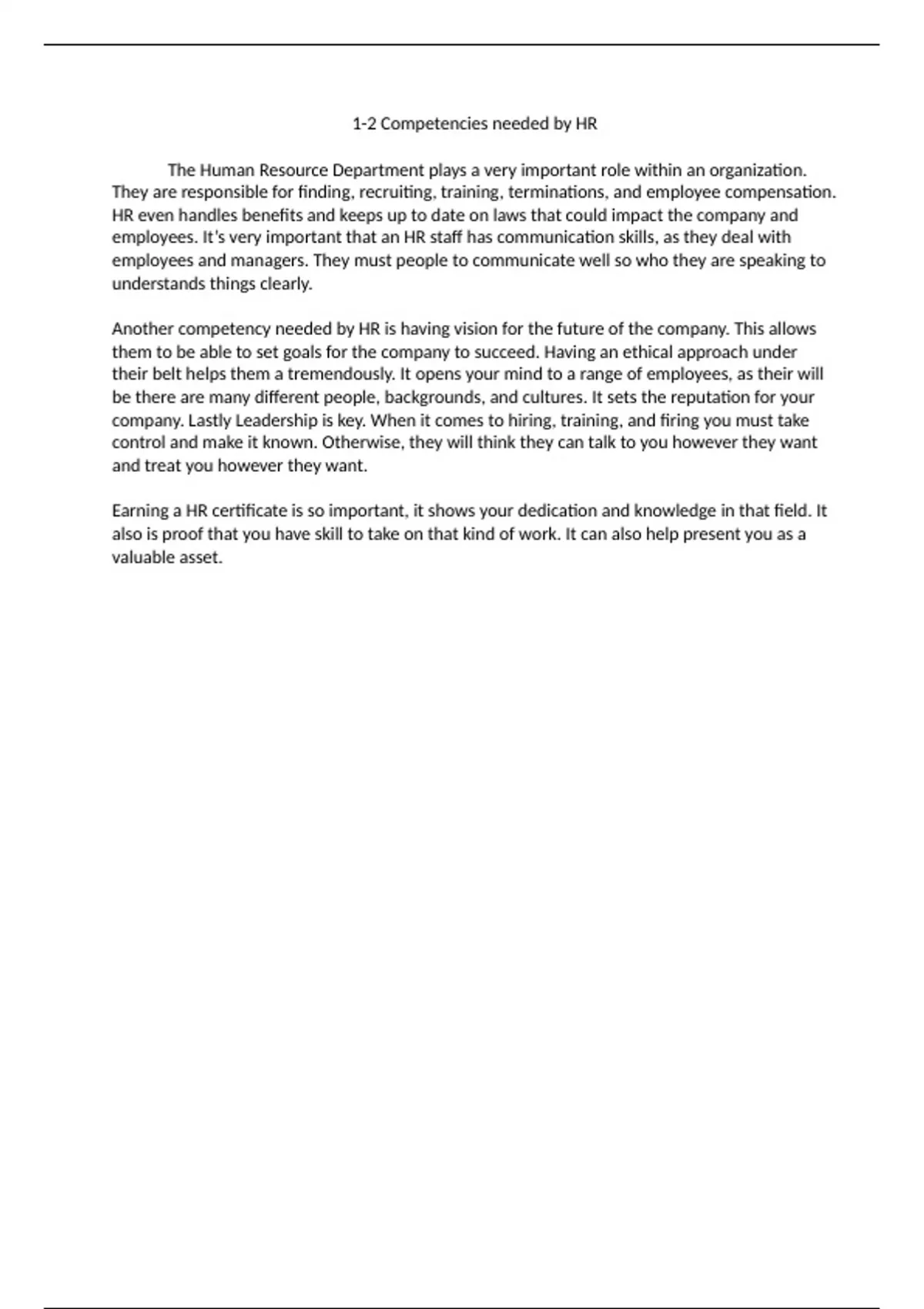 One to two paragraphs explaining the competencies needed by HR professionals and why HR certification is important.