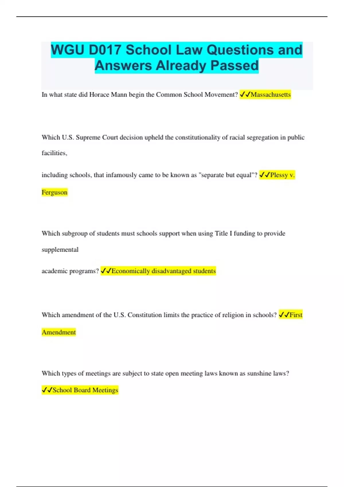 WGU D017 School Law Questions and Answers Already Passed In what state did Horace Mann begin the Common School Movement? Massachusetts Which U.S. Supreme Court decision upheld the constitutionality of racial segregation in public facilities, including schools, that infamously came to be known as "separate but equal"? Plessy v. Ferguson Which subgroup of students must schools support when using Title I funding to provide supplemental academic programs? Economically disadvantaged students Which amendment of the U.S. Constitution limits the practice of religion in schools? First Amendment Which types of meetings are subject to state open meeting laws known as sunshine laws? School Board Meetings What are state legislative bodies responsible for? Requirements for student graduation Which type of educational law has inuenced how a school district develops their programs for English learners? Case law Which school board practice is often used as a means of ensuring or ignoring the ruling that "separate but equal" is unconstitutional? School attendance zones Which testing school practice was influenced by Brown v. Board of Education? Subgroup data analysis of testing results What would be the purpose of changing school zone boundaries? Desegregation of schools Which ruling was violated when students with disabilities were placed in separate schools? 14th Amendment What is the motivation for communities seceding from school districts? Circumventing integration Which amendment does the Lemon test determine violation of? First Amendment Which legal justification is used by some states for the use of public funds to purchase textbooks for students in parochial schools? The child benefit theory Which law provides protection to students who choose to kneel during the Pledge of Allegiance? First Amendment Which law would allow a student worship club to hold after school meetings on a high school campus, given the school has a limited open forum? Equal Access Act A rural elementary school allows a moment of meditation during the first period of the day. Some students engage in a silent prayer during this period. Teachers express concern that this period promotes prayer in school. Based on case law surrounding prayer in schools, how should the administrator respond? Continue using the meditation period as is since it is not designed to promote religion. Which action do local authorities have the right to take when states maintain control over curriculum in public schools? Provide additions to curriculum beyond those required by the state What did the U.S. Supreme Court decision in Lau v. Nichols require of public schools? That they provide supplemental language instruction to students with limited English proficiency Which criterion did Castañeda v. Pickard set for educational programs targeting English learners? Programs must be based on research. Which U.S. Supreme Court case established that schools must provide supplemental supports to English learners? Lau v. Nichols What is the Tinker test often used for? To determine a violation of First Amendment rights A group of students wore shirts with political messages displayed on them. The principal received several complaints from parents that evening who demanded they be banned from wearing clothing with political messages that could be viewed as offensive or insensitive to specific groups of students at the school. Which court case ruling should the principal apply in deciding whether to ban students from wearing clothing with political messages? Tinker v. Des Moines Which student rights were found to be violated In the landmark case of T.L.O. v. New Jersey? Unreasonable search and seizure A high school principal gets an anonymous call that several students at the school are members of rival neighborhood gangs and that tension has severely escalated over the weekend. The individual is afraid that the conflict will carry into school on Monday morning and gun violence could ensue. Since the caller did not provide specific names of students, the principal decided to call the local police department for assistance in searching every student with metal detectors prior to entering the school for the next week. Several parents began calling saying that their child was not involved in any of this and that forcing them to go through a metal detector search was a violation of their Fourth Amendment rights. What response should the principal provide in reaction to the parent complaints? The use of metal detectors does not violate student