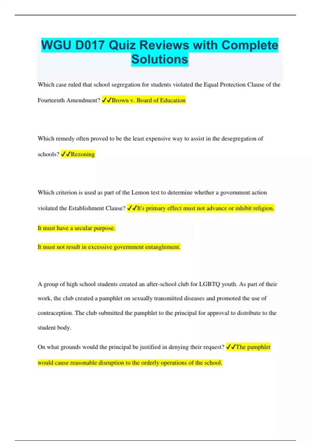 WGU D017 Quiz Reviews with Complete Solutions Which case ruled that school segregation for students violated the Equal Protection Clause of the Fourteenth Amendment? Brown v. Board of Education Which remedy often proved to be the least expensive way to assist in the desegregation of schools? Rezoning Which criterion is used as part of the Lemon test to determine whether a government action violated the Establishment Clause? It's primary effect must not advance or inhibit religion. It must have a secular purpose. It must not result in excessive government entanglement. A group of high school students created an after-school club for LGBTQ youth. As part of their work, the club created a pamphlet on sexually transmitted diseases and promoted the use of contraception. The club submitted the pamphlet to the principal for approval to distribute to the student body. On what grounds would the principal be justified in denying their request? The pamphlet would cause reasonable disruption to the orderly operations of the school. In which situation is prayer allowed in public schools? Private prayer initiated by students that does not use school resources With the passage of ESSA, which accountability measure under NCLB were states no longer responsible for meeting? Adequate yearly progress Which aspect of education is typically within the control of local school boards? Curriculum offered within the district Which criterion for educational programs targeting ELs was established by Castañeda v. Pickard? Programs must be based on sound educational theory. Programs must be implemented effectively. Programs must be proven effective in overcoming language barriers after a trial period. During a school talent show, a student performed a rap song that negatively targeted and criticized several students and teachers at the school. The performance was the basis for a fight at lunch. Under which basis is disciplinary action by school administration warranted because the student overreached his First Amendment rights? Material and substantive disruption Many school boards have adjusted their policies on student dress and hairstyles. What is the major influence on these decisions? Such displays do not cause substantive disruption to the orderly operations of the school. A principal receives a call from a parent stating that her child informed her of a student who has been selling drugs at school. Which legal right gives school personnel the authority to search the student's locker and personal belongings? Reasonable suspicion The Dean of students at a local high school received an anonymous email accusing the senior class President of selling drugs from his locker. The email included the class President's locker combination and a price list for the drugs, along with names of students who allegedly purchased the drugs. What is the appropriate administrative action based on this email? Quietly interview the students listed to determine the reasonableness of a search. An assistant principal noticed two seventh-grade girls wearing controversial rock band T-shirts as they boarded the school bus for a field trip. The assistant principal removed the students and told them they could not go on the trip. The students were given in-school suspensions as an alternative. Which right did the assistant principal violate? Freedom of Speech An administrator suspends a student for five days pending a scheduled hearing to extend the suspension. During the five-day suspension, the administrator calls a meeting with the student and parent to explain the circumstances leading to the suspension and the need for a hearing. Of which aspect of school law is this meeting an example? Due Process In a suburban school district, two students fought in class, which caused a significant disruption to instruction. After removing the students from the classroom, the assistant principal hit each student three times with a paddle. Provided that the school is located in a state with no specific state-based legislation barring corporal punishment, how would the assistant principal's actions be justified? The use of corporal punishment is permissible since it has not been found to violate the Eighth Amendment. A transgender student complains to the principal that he is being harassed and and being ridicule by students. He explains that this started in the class of a specific teacher, where it happens almost daily, and the teacher encourages the behavior and sometimes participates. The principal has a discussion with the teacher and moves the student to a different class to remedy the situation. Although the student had no further problems with the teacher, the harassment from the students intensified in common areas. The principal asks for the names of those students, but the transgender student does not provide them in fear of retaliation. The principal's response is that he can not address the issue or discipline those students if he does not know who they were. What action should the principal have taken to ensure he was not acting in deliberate indifference? Create a plan to address the issue of harassment with the entire school population. A local high school junior disclosed to her counselor that a peer had been sending her vulgar and inappropriate texts via a messaging app. The student, reported that the texts included cruel references to her appearance and specifically stated various things that would happen if she shared this information with others. What is the appropriate next action for the counselor to take? Begin the formal cyber-bullying investigation process. Mrs. Gonzalez requested the most recent report card for her stepson, Jamie, from the front office. The records clerk stated he could not give the report card to her because she is not on the child's birth certificate. Which law supports Mrs. Gonzalez's request for student records? FERPA The police department calls the school to confirm that a 15-year-old student was present 
