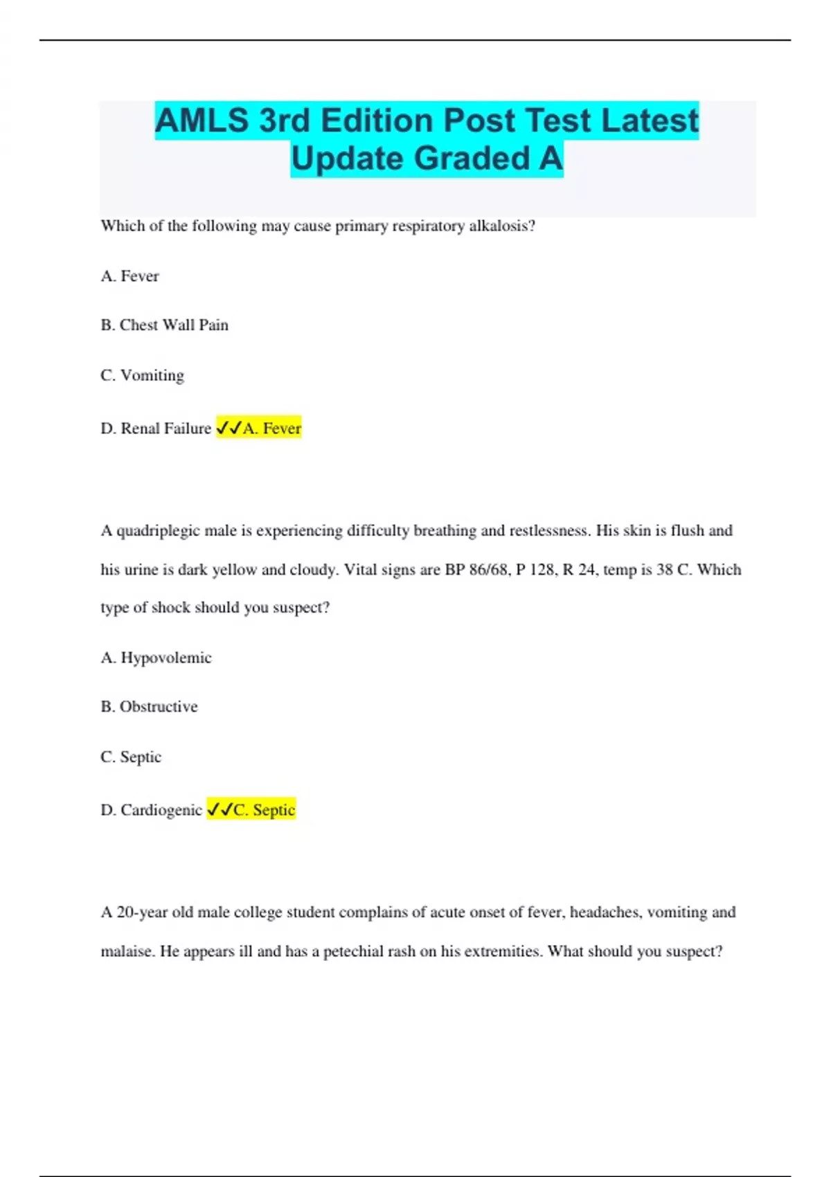 AMLS 3rd Edition Post Test Latest Update Graded A Which of the following may cause primary respiratory alkalosis? A. Fever B. Chest Wall Pain C. Vomiting D. Renal Failure A. Fever A quadriplegic male is experiencing difficulty breathing and restlessness. His skin is flush and his urine is dark yellow and cloudy. Vital signs are BP 86/68, P 128, R 24, temp is 38 C. Which type of shock should you suspect? A. Hypovolemic B. Obstructive C. Septic D. Cardiogenic C. Septic A 20-year old male college student complains of acute onset of fever, headaches, vomiting and malaise. He appears ill and has a petechial rash on his extremities. What should you suspect? A. Acute gastroenteritis B. Encephalitis C. Meningitis D. Influenza C. Meningitis A 20-year old male complains of severe pain after a jellyfish sting. He has a red, swollen ankle and foot. What should you do? A. Apply a hot pack to the area and mark the affected area B. Splint the limb and administer an antipyretic C. Wash the area and administer an analgesic D. Apply an ice pack and administer an opiod C. Wash the area and administer an analgesic The renin-angiotensin-aldosterone system is activated during shock in order to cause the following? A. Increase in preload, afterload, and reabsorption of sodium B. Hypotension and bradycardia C. Decrease in Preload, afterload, and reabsorption of sodium D. Vasodilation and sodium reabsorption A. Increase in preload, afterload, and reabsorption of sodium An elderly COPD patient complains of difficulty in breathing upon exertion. She has a 1-week history of productive cough. She has pursed lip breathing. She is prescribed a bronchodilator as needed. Vital signs are BP 132/70, P 88, R 20 with Rhonchi. What should you suspect? A. Pulmonary embolism B. Epiglottitis C. Chronic Bronchitis D. Congestive Heart Failure C. Chronic Bronchitis An anxious 32 year old female complains of chest pain with palpitations. She has a history of Graves' disease. She reports she was seen in the ED earlier that day and has a CT scan of her abdomen with IV contrast. She is diaphoretic and has a temperature of 101.5 F. Vital signs are 100/62 P 156 R30 BGL 133 mg/dL. What should you administer? A. Calcium Chloride B. Normal Saline C. Amiodarone D. Aspirin (ASA) B. Normal Saline What statement is correct regarding responding to a suspected nerve agent exposure? A. Secondary contamination rarely occurs in nerve agent exposure B. Parking downwind will ensure first responder safety C. Patients should be treated in well-ventilated areas D. Nerve agents degrade immediately when exposed to sunlight. C. Patients should be treated in well-ventilated areas. What reference is the MOST beneficial to obtain for a suspected stroke? A. Past Medical History B. Last Oral Intake C. Last Known Well D. Daily Aspirin Dose C. Last Known Well Which of the following statements is correct regarding radioactive materials? A. Gamma rays are unable to penetrate bone and connective tissue B. Neutrons are low energy particles and do not cause bodily harm C. Alpha particles are harmless when ingested and inhaled D. Simple clothing can stop beta particles from entering the body D. Simple clothing can stop beta particles from entering the body What finding is unique to pericarditis? A. Diffuse ST segment elevation B. Pain is relieved when supine C. S3 gallop is auscultated D. Pulses alternans is present A. Diffuse ST segment elevation A 21-year old male complains of sharp chest pain and shortness of breath. The symptoms started when he lifted a heavy object. Vital signs are BP 152/96 P 108 R 24 and diminished on the left. What should you suspect? A. Spontaneous Pneumothorax B. Pectoralis muscle tear C. Aortic Dissection D. Pulmonary Embolism A. Spontaneous Pneumothorax A 72- year old female complains of a sudden onset of a burning sensation to the left side of her forehead and blurred vision. She wants to follow up with her family physician tomorrow. Vital signs are BP 150/70 P 80 R 16 What should you do? B. Encourage her to be transported by ambulance to the hospital An anxious 61-year old male complains of severe shortness of breath and localized chest pain with blood-tinged sputum. His dyspnea started when he stood up from watching television all day and increased in severity as he moved around. Vital signs are BP 104/60 P 98 and irregular R 26 and labored. What should you suspect? B. Pulmonary Embolism Anaphylaxis is most commonly associated with which physiological event? C. Vasodilation A confused 67 year old male has vomited multiple times prior to EMS arrival. He was involved in a car crash 48 hours prior. Bystanders state he became increasingly confused and lost coordination since the crash. Vital signs are BP 150/88 P 72 R 16 BGL 92 mg/dL. What should you suspect? D. Subdural hematoma What condition causes paroxysmal nocturnal dyspnea? B. Left-sided heart failure What is the initial treatment for a patient experiencing hyperosmolar hyperglycemic state? B. Normal Saline An 18 year old male nearly drowned at a local lake after treading water for 25 minutes. He is shivering uncontrollably and complains of nausea and weakness. Vital signs are BP 122/62 R 28 P 136 and a temp of 93.2 F. What should you suspect? A. Mild Hypothermia A 45 year old male complains of shortness of breath. He has a history of alcohol abuse and presents with severe ascites. Vitals are BP 142/78 P 104 R 24 with crackles. What should you suspect? C. Liver failure A 22 year old male has recently undergone a surgical procedure to repair an injury to thoracic vertabrae T1-T2. Assessment indicates the patient is alert and oriented, bradycardic, hypotensive and has warm, dry skin. Which type of shock is most likely occurring? D. Neurogenic It is 0600 hours and you are treating a 63 year old female with slurred speech, facial droop, and altered mental status. At 0400 hours her husband heard her go to the bathroom. At 2300 hours they went to bed and everything was "fine". How should yo