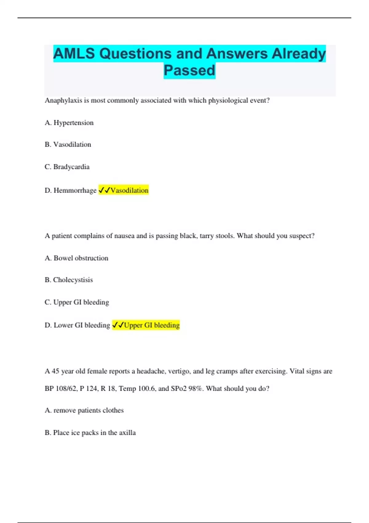 AMLS Questions and Answers Already Passed Anaphylaxis is most commonly associated with which physiological event? A. Hypertension B. Vasodilation C. Bradycardia D. Hemmorrhage Vasodilation A patient complains of nausea and is passing black, tarry stools. What should you suspect? A. Bowel obstruction B. Cholecystisis C. Upper GI bleeding D. Lower GI bleeding Upper GI bleeding A 45 year old female reports a headache, vertigo, and leg cramps after exercising. Vital signs are BP 108/62, P 124, R 18, Temp 100.6, and SPo2 98%. What should you do? A. remove patients clothes B. Place ice packs in the axilla C. provide oral fluid replacements D. administer 25 g of D50 Provide oral fluid replacement A confused 67 year old male has vomited multiple times prior to EMS arrival. He was involved in a car crash 48 hours prior. Bystanders state he became increasingly confused and lost coordination since the crash. vital sings are BP 150/88, P 72, R 18, BGL 92 mg/dL. What should you suspect? A. Epidural Hematoma B. Subdural hematoma C. Carotid dissection D. Absence seizure Subdural Hematoma A 44 year old female complains of a sudden onset of sharp pain in her right flank that radiates to her groin area. Intermittently the pain becomes very severe. She also reports nausea. Vital signs are BP 152/92, P 104, R 16, SpO2 98%. What is the most likely cause? A. Diverticulitis B. Crohn's disease C. Acute hepatitis D. Kidney Stones Kidney Stones A