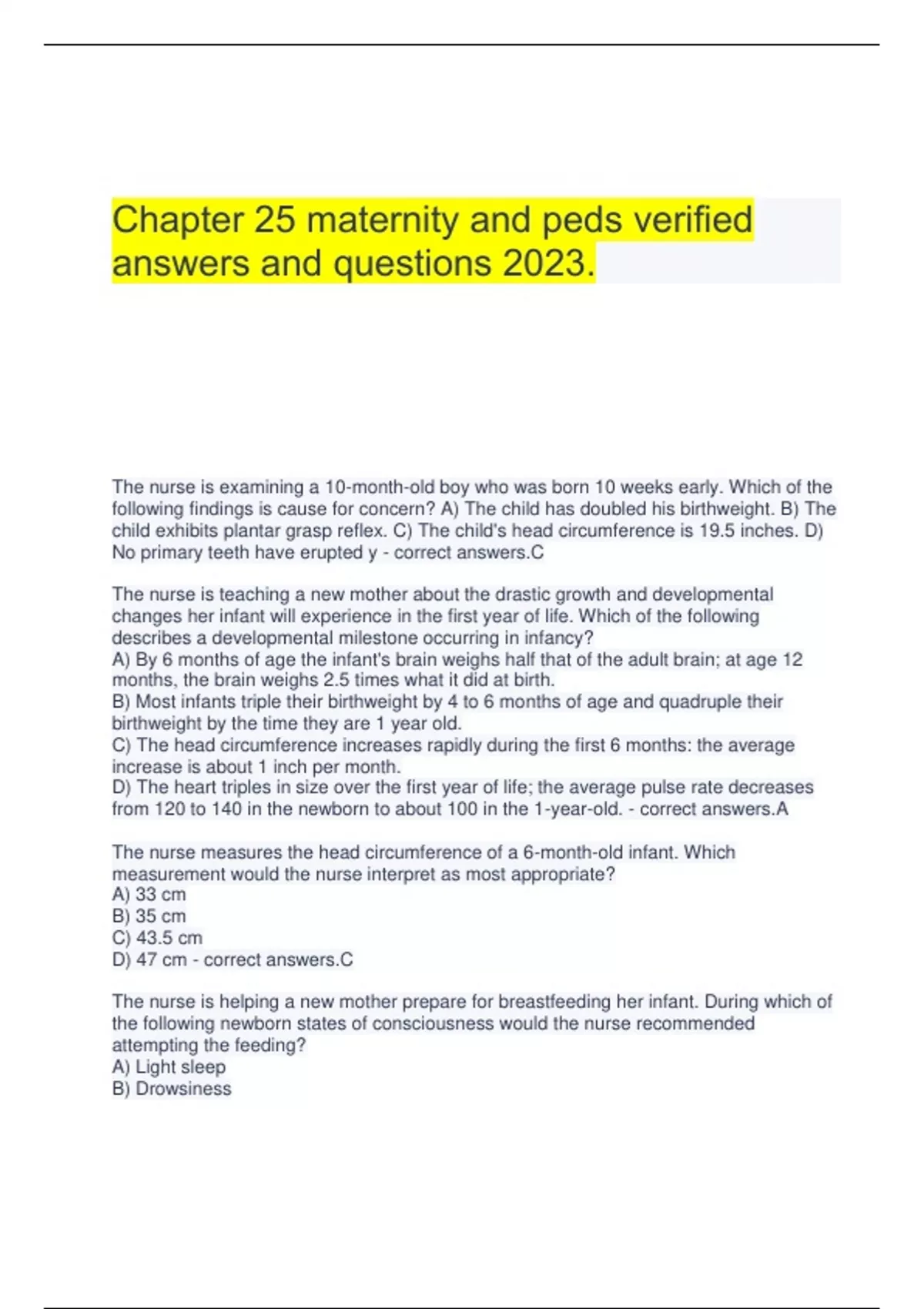 Chapter 25 maternity and peds verified answers and questions 2023. The nurse is examining a 10-month-old boy who was born 10 weeks early. Which of the following findings is cause for concern? A) The child has doubled his birthweight. B) The child exhibits plantar grasp reflex. C) The child's head circumference is 19.5 inches. D) No primary teeth have erupted y - correct answers.C The nurse is teaching a new mother about the drastic growth and developmental changes her infant will experience in the first year of life. Which of the following describes a developmental milestone occurring in infancy? A) By 6 months of age the infant's brain weighs half that of the adult brain; at age 12 months, the brain weighs 2.5 times what it did at birth. B) Most infants triple their birthweight by 4 to 6 months of age and quadruple their birthweight by the time they are 1 year old. C) The head circumference increases rapidly during the first 6 months: the average increase is about 1 inch per month. D) The heart triples in size over the first year of life; the average pulse rate decreases from 120 to 140 in the newborn to about 100 in the 1-year-old. - correct answers.A The nurse measures the head circumference of a 6-month-old infant. Which measurement would the nurse interpret as most appropriate? A) 33 cm B) 35 cm C) 43.5 cm D) 47 cm - correct answers.C The nurse is helping a new mother prepare for breastfeeding her infant. During which of the following newborn states of consciousness would the nurse recommended attempting the feeding? A) Light sleep B) Drowsiness C) Quiet alert state D) Active alert state - correct answers.C The nurse is assessing the respiratory system of a newborn. Which of the following anatomic differences place the infant at risk for respiratory compromise? Select all answers that apply. A) The nasal passages are narrower. B) The trachea and chest wall are less compliant. C) The bronchi and bronchioles are shorter and wider. D) The larynx is more funnel shaped. E) The tongue is smaller. F) There are significantly fewer alveoli. - correct answers.ADF A new mother shows the nurse that her baby grasps her finger when she touches the baby's palm. How might the nurse respond to this information? Test Bank - Maternity and Pediatric Nursing (3rd Edition) by Ricci, Kyle, and Carman 139 A) "This is a primitive reflex known as the plantar grasp." B) "This is a primitive reflex known as the palmar grasp." C) "This is a protective reflex known as rooting." D) "This is a protective reflex known as the Moro reflex." - correct answers.B Which reflex, if found in a 4-month-old infant, would cause the nurse to be concerned? A) Plantar grasp B) Step C) Babinski D) Neck righting - correct answers.B A new mother expresses concern to the nurse that her baby is crying and grunting when passing stool. What is the nurse's best response to this observation? A) "This is normal behavior for infants unless the stool passed is hard and dry." B) "This is normal behavior for infants due to the immaturity of the gastrointestinal system." C) "This indicates a blockage in the intestine and must be reported to the physician." D) "This is normal behavior for infants unless the stool passed is black or green. - correct answers.A The neonatal nurse assesses newborns for iron-deficiency anemia. Which of the following newborns is at highest risk for this disorder? A) A postterm newborn B) A term newborn with jaundice C) A newborn born to a diabetic mother D) A premature newborn - correct answers.D The nurse caring for newborns knows that infants exhibit phenomenal increases in their gross motor skills over the first 12 months of life. Which of the following statements accurately describe the typical infant's achievement of these milestones? Select all answers that apply. A) At 1 month the infant lifts and turns the head to the side in the prone position. B) At 2 months the infant lifts head and looks around. C) At 6 months the infant pulls to stand up. D) At 7 months the infant sits alone with some use of hands for support. E) At 9 months the infant crawls with the abdomen off the floor. F) At 12 months the infant walks independently. - correct answers.ADEF At which age would the nurse expect to find the beginning of object permanence? A) 1 month B) 4 months C) 8 months D) 12 months - correct answers.B The nurse is teaching a new mother about the development of sensory skills in her newborn. Which of the following would alert the mother to a sensory deficit in her child? A) The newborn's eyes wander and occasionally are crossed. B) The newborn does not respond to a loud noise. C) The newborn's eyes focus on near objects. D) The newborn becomes more alert with stroking when drowsy. - correct answers.B The nurse is assessing a 4-month-old boy during a scheduled visit. Which of the following findings might suggest a developmental problem? A) The child does not coo or gurgle. B) The child does not babble or laugh. C) The child never squeals or yells. D) The child does not say dada or mama. - correct answers.B The nurse observes an infant interacting with his parents. Which of the following are normal social behavioral developments for this age group? Select all answers that apply. A) Around 5 months the infant may develop stranger anxiety. B) Around 2 months the infant exhibits a first real smile. C) Around 3 months the infant smiles widely and gurgles when interacting with the caregiver. D) Around 3 months the infant will mimic the parent's facial movements, such as sticking out the tongue. E) Around 3 to 6 months of age the infant may enjoy socially interactive games such as patty-cake and peek-a-boo. F) Separation anxiety may also start in the last few months of infancy. - correct answers.BCDF The nurse is performing a health assessment of a 3-month-old Black American boy. For what condition should this infant be monitored based on his race? A) Jaundice B) Iron deficiency C) Lactose intolerance D) Gastroesophageal refl