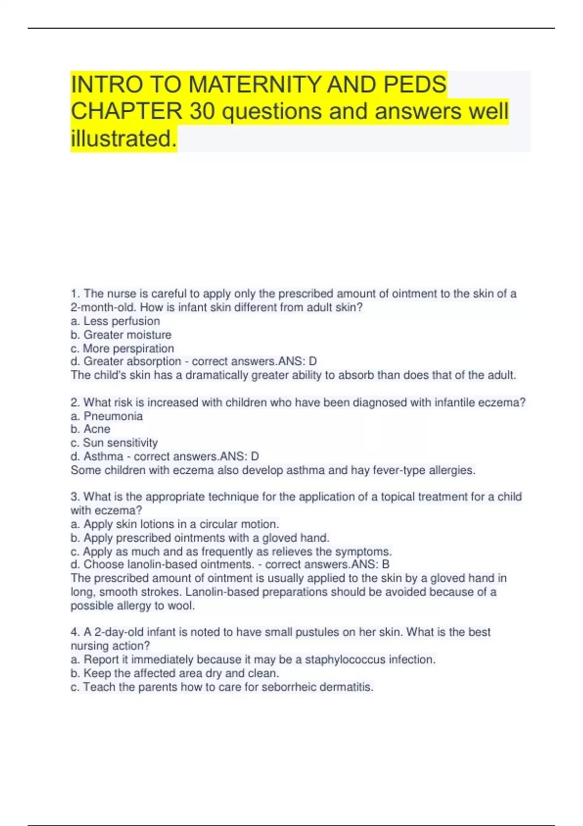INTRO TO MATERNITY AND PEDS CHAPTER 30 questions and answers well illustrated. 1. The nurse is careful to apply only the prescribed amount of ointment to the skin of a 2-month-old. How is infant skin different from adult skin? a. Less perfusion b. Greater moisture c. More perspiration d. Greater absorption - correct answers.ANS: D The child's skin has a dramatically greater ability to absorb than does that of the adult. 2. What risk is increased with children who have been diagnosed with infantile eczema? a. Pneumonia b. Acne c. Sun sensitivity d. Asthma - correct answers.ANS: D Some children with eczema also develop asthma and hay fever-type allergies. 3. What is the appropriate technique for the application of a topical treatment for a child with eczema? a. Apply skin lotions in a circular motion. b. Apply prescribed ointments with a gloved hand. c. Apply as much and as frequently as relieves the symptoms. d. Choose lanolin-based ointments. - correct answers.ANS: B The prescribed amount of ointment is usually applied to the skin by a gloved hand in long, smooth strokes. Lanolin-based preparations should be avoided because of a possible allergy to wool. 4. A 2-day-old infant is noted to have small pustules on her skin. What is the best nursing action? a. Report it immediately because it may be a staphylococcus infection. b. Keep the affected area dry and clean. c. Teach the parents how to care for seborrheic dermatitis. d. Chart the finding because it may be the beginning of a strawberry nevus. - correct answers.ANS: A A staphylococcal infection can spread readily 5. The home health nurse discovers a family infected with pediculosis. What information can the nurse provide to the mother to start eradication of the lice? a. Cover the hair with Vaseline. b. Apply a soda-vinegar solution to the hair. c. Comb through the hair with a vinegar-water solution. d. Shampoo the hair with dish detergent. - correct answers.ANS: C Combing a vinegar and water solution through the hair with a fine-tooth comb and then shampooing is an initial step toward eradication. 6. A group of football players is taking oral griseofulvin for tinea pedis. What should the school nurse caution them to avoid? a. Citrus fruit and juice b. Eating shellfish c. Alcohol consumption d. Taking corticosteroids - correct answers.ANS: C Consumption of alcohol while taking griseofulvin will cause severe tachycardia. 7. What should the nurse suggest before a 17-year-old girl starts a protocol of isotretinoin (Accutane) for her acne? a. Get a prescription for oral contraceptives. b. Increase the dose of the present medication. c. Limit intake of chocolate, cola, and peanuts. d. Increase exposure to sunlight. - correct answers.ANS: A Oral contraceptives are often prescribed for adolescents with acne. Accutane can cause birth defects, so pregnancy should be prevented. 8. A child had a burn, evidenced by pink skin and blistering. The child complains of pain and is crying. How does the nurse classify this burn when documenting? a. First-degree b. Second-degree superficial c. Second-degree deep dermal d. Third-degree - correct answers.ANS: B A second-degree superficial burn appears blistered, moist, and pink or red. The pain associated with this burn indicates tissue viability. 9. A child has sustained a second-degree deep thermal burn to the hand. What is the best first action to take? a. Immerse the burned area in cold water. b. Apply ice to the burned area. c. Break any blisters that are present. d. Apply petroleum jelly to the burned skin. - correct answers.ANS: A First-aid treatment of a second-degree deep thermal burn is immersion of the burned area in water to halt the burning process. 10. Which allergy would contraindicate the use of silver sulfadiazine (Silvadene) as a topical agent for burns? a. Penicillin b. Iodine c. Tetanus immunizations d. Sulfa - correct answers.ANS: D The use of Silvadene cream on burns is contraindicated if the patient has a sulfa allergy. 11. What would help the child with a serious burn meet nutritional needs during the subacute phase of recovery? a. Decrease calories because the child will be on bed rest and will not need as many. b. Increase calories and protein to compensate for the healing process. c. Increase fat to replace the layer of fat next to the burned skin. d. Decrease carbohydrates and starches because the pancreas is strained by the healing process. - correct answers.ANS: B Frequent meals and snacks high in calories, protein, and iron are needed to meet the increased metabolic needs of the child with burns. 12. Which statement made by a parent indicates an understanding of the topical application of medications for a skin condition? a. "I apply the medication after I give my child a bath." b. "I rub the ointment in a circular motion over the rash." c. "I increased the amount of cream because the rash was not improving." d. "I use powder and cornstarch to keep the skin dry." - correct answers.ANS: A Absorption of topical medications is best when preparations are applied after a warm bath 13. On the first day following a severe burn, the body's fluid reserves have left the circulating volume and entered the interstitial space, causing massive edema. What should the nurse monitor for very closely in the burn victim? a. Increasing intracranial pressure b. Reduced urine output c. Eschar formation d. Fluid overload - correct answers.ANS: B With the fluid shift associated with severe bu 14. At a 2-month well-child visit, parents ask the nurse about the red area on the infant's neck. They tell the nurse that the mark appeared a few weeks after birth. What does the nurse recognize this skin lesion as? a. A port wine nevus b. A strawberry nevus c. Exanthem d. Intertrigo - correct answers.ANS: B The strawberry nevus is a common hemangioma consisting of dilated capillaries in the dermal space, which may not become apparent for a few weeks after birth. 15. A mother is concerned about what might have c