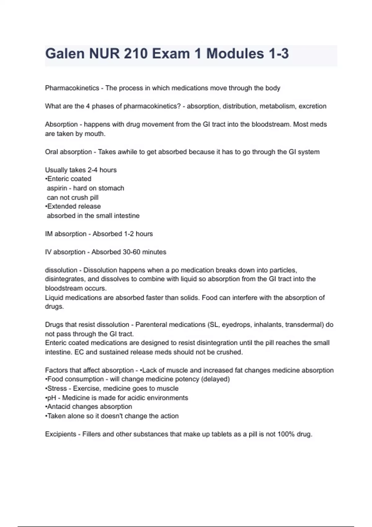 Galen NUR 210 Exa Pharmacokinetics - The process in which medications move through the body What are the 4 phases of pharmacokinetics? - absorption, distribution, metabolism, excretion Absorption - happens with drug movement from the GI tract into the bloodstream. Most meds are taken by mouth. Oral absorption - Takes awhile to get absorbed because it has to go through the GI system m 1 Modules 1-3 full solution 2023