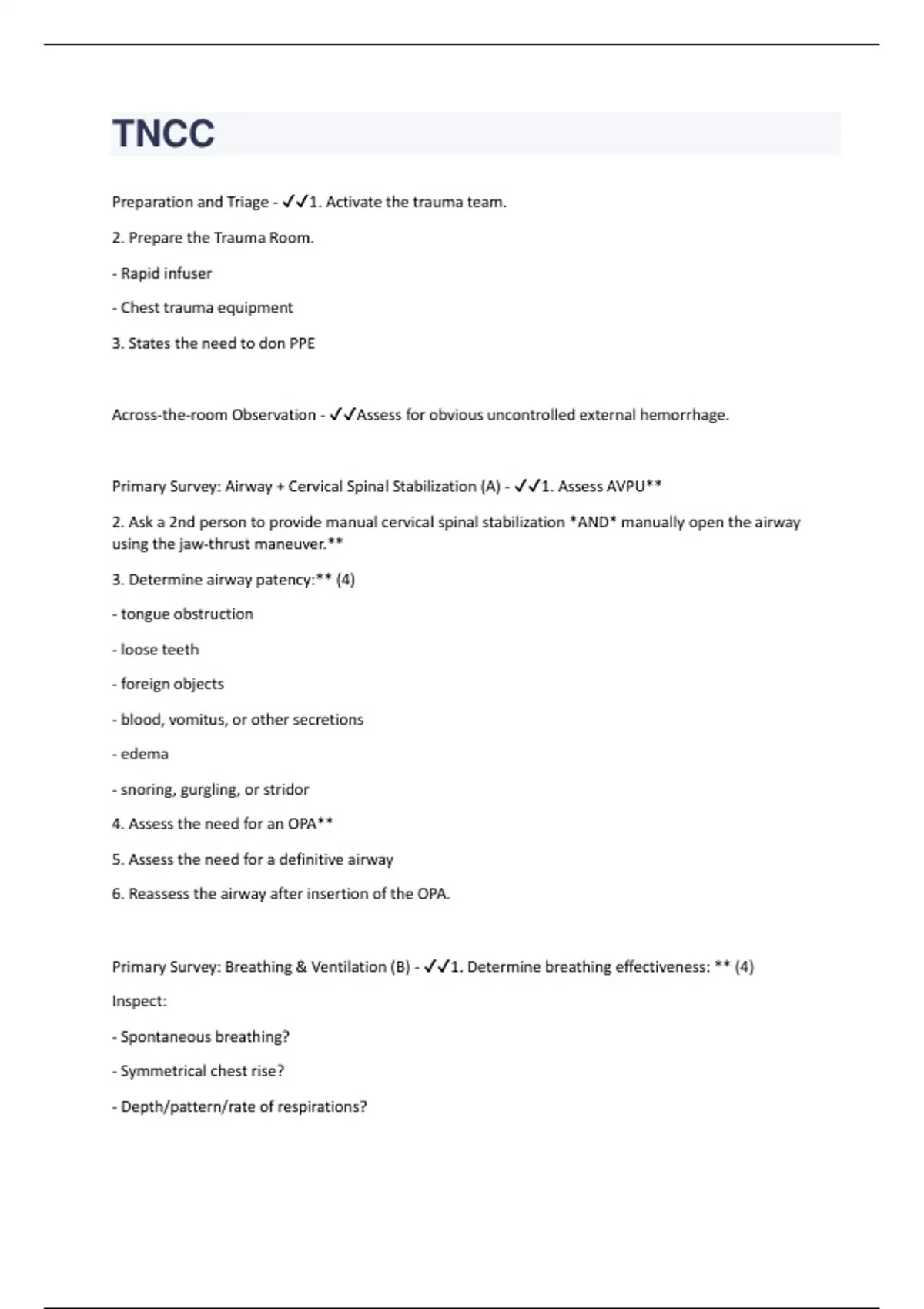 Preparation and Triage - 1. Activate the trauma team. 2. Prepare the Trauma Room. - Rapid infuser - Chest trauma equipment 3. States the need to don PPE Across-the-room Observation - Assess for obvious uncontrolled external hemorrhage. Primary Survey: Airway + Cervical Spinal Stabilization (A) - 1. Assess AVPU** 2. Ask a 2nd person to provide manual cervical spinal stabilization *AND* manually open the airway using the jaw-thrust maneuver.** 3. Determine airway patency:** (4) - tongue obstruction - loose teeth - foreign objects - blood, vomitus, or other secretions - edema - snoring, gurgling, or stridor 4. Assess the need for an OPA** 5. Assess the need for a definitive airway 6. Reassess the airway after insertion of the OPA. Primary Survey: Breathing & Ventilation (B) - 1. Determine breathing effectiveness: ** (4) Inspect: - Spontaneous breathing? - Symmetrical chest rise? - Depth/pattern/rate of respirations?