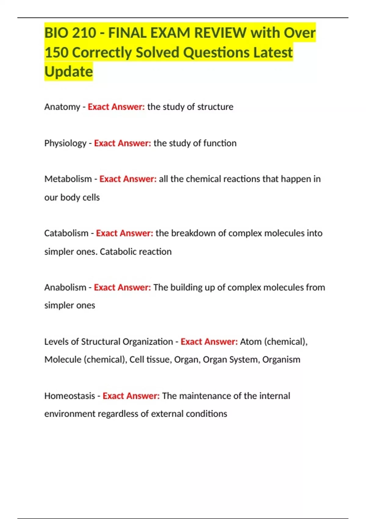 BIO 210 - FINAL EXAM REVIEW with Over 150 Correctly Solved Questions Latest Update