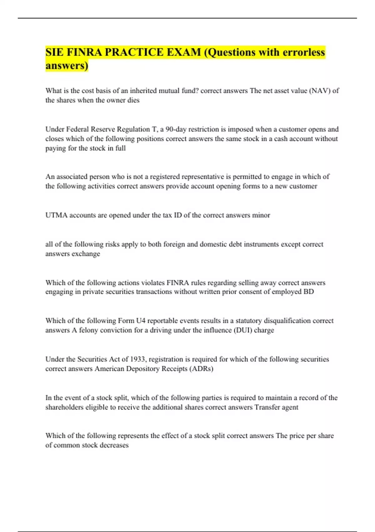 SIE FINRA PRACTICE EXAM (Questions with errorless answers)
