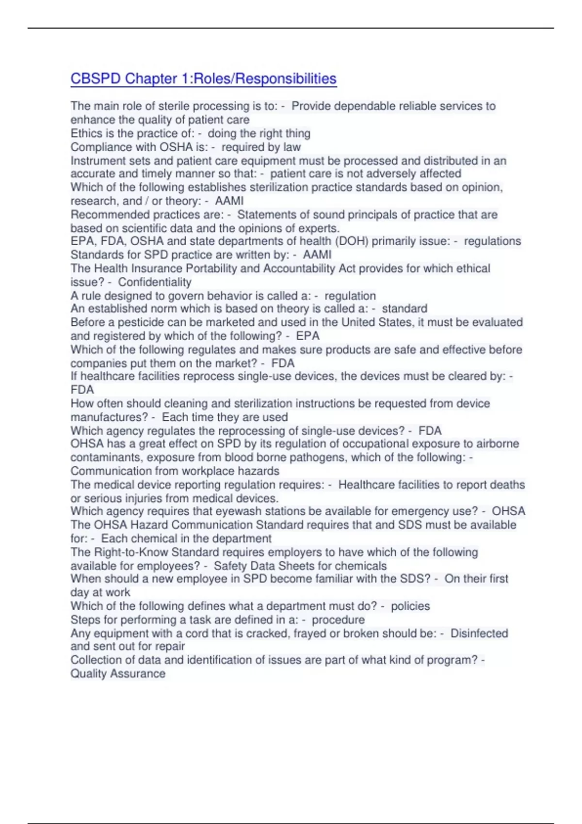The main role of sterile processing is to: - Provide dependable reliable services to enhance the quality of patient care Ethics is the practice of: - doing the right thing Compliance with OSHA is: - required by law Instrument sets and patient care equipment must be processed and distributed in an accurate and timely manner so that: - patient care is not adversely affected Which of the following establishes sterilization practice standards based on opinion, research, and / or theory: - AAMI Recommended practices are: - Statements of sound principals of practice that are based on scientific data and the opinions of experts. EPA, FDA, OSHA and state departments of health (DOH) primarily issue: - regulations Standards for SPD practice are written by: - AAMI The Health Insurance Portability and Accountability Act provides for which ethical issue? - Confidentiality A rule designed to govern behavior is called a: - regulation An established norm which is based on theory is called a: - standard Before a pesticide can be marketed and used in the United States, it must be evaluated and registered by which of the following? - EPA Which of the following regulates and makes sure products are safe and effective before companies put them on the market? - FDA If healthcare facilities reprocess single-use devices, the devices must be cleared by: - FDA How often should cleaning and sterilization instructions be requested from device manufactures? - Each time they are used Which agency regulates the reprocessing of single-use devices? - FDA OHSA has a great effect on SPD by its regulation of occupational exposure to airborne contaminants, exposure from blood borne pathogens, which of the following: - Communication from workplace hazards The medical device reporting regulation requires: - Healthcare facilities to report deaths or serious injuries from medical devices. Which agency requires that eyewash stations be available for emergency use? - OHSA The OHSA Hazard Communication Standard requires that and SDS must be available for: - Each chemical in the department The Right-to-Know Standard requires employers to have which of the followi