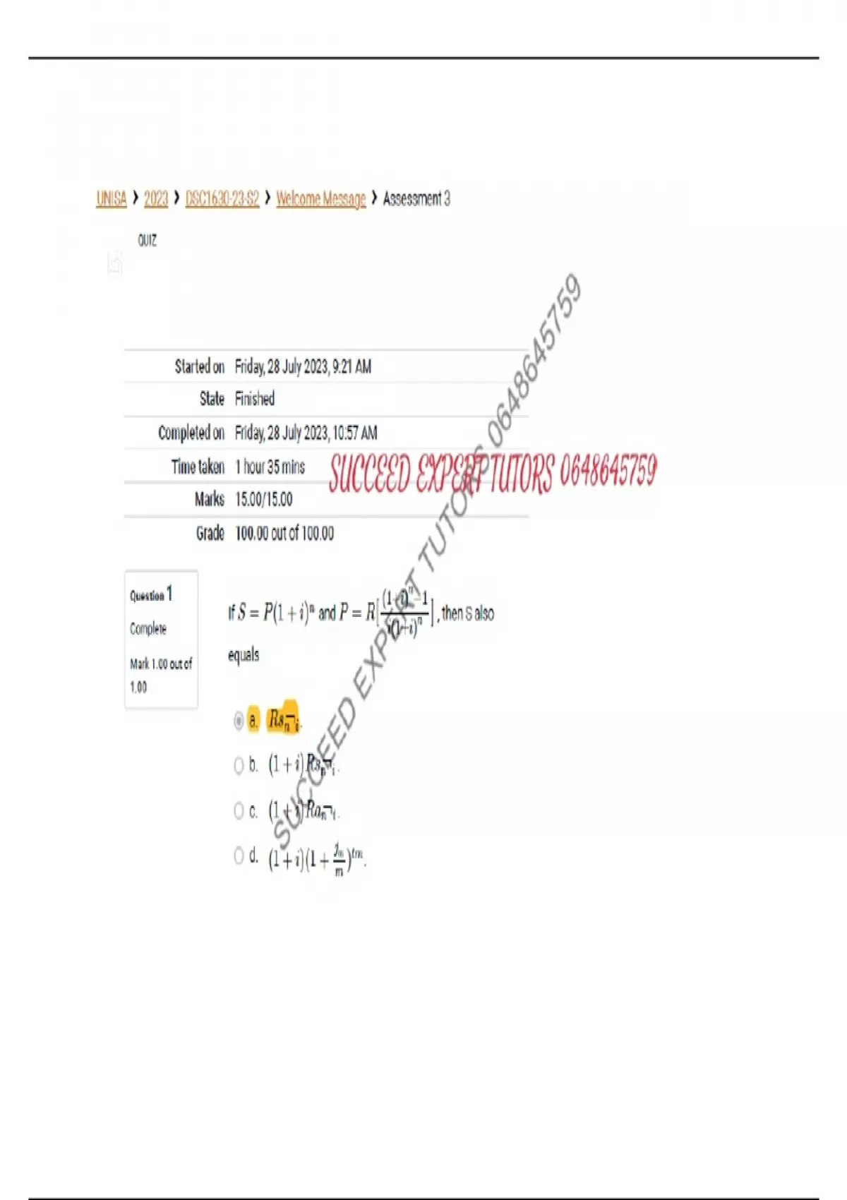 This document contains solution to assignment 3 dsc1630 semester 2 2023. all solutions have got steps and calculations for your practice both manual calculations and when using HP or SHARP Financial calculator. 100% mark guaranteed