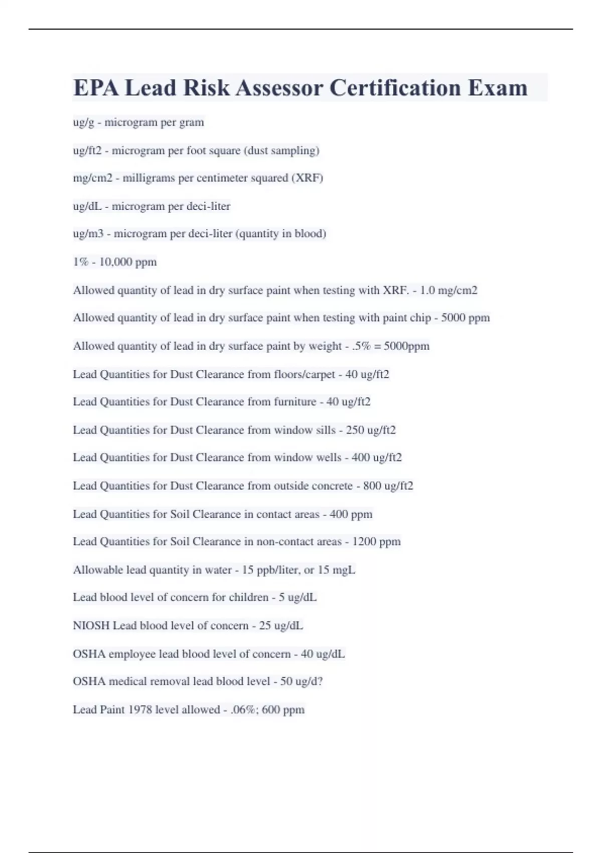 EPA Lead Risk Assessor Certification Exam ug/g - microgram per gram ug/ft2 - microgram per foot square (dust sampling) mg/cm2 - milligrams per centimeter squared (XRF) ug/dL - microgram per deci-liter ug/m3 - microgram per deci-liter (quantity in blood) 1% - 10,000 ppm Allowed quantity of lead in dry surface paint when testing with XRF. - 1.0 mg/cm2 Allowed quantity of lead in dry surface paint when testing with paint chip - 5000 ppm Allowed quantity of lead in dry surface paint by weight - .5% = 5000ppm Lead Quantities for Dust Clearance from floors/carpet - 40 ug/ft2 Lead Quantities for Dust Clearance from furniture - 40 ug/ft2 Lead Quantities for Dust Clearance from window sills - 250 ug/ft2 Lead Quantities for Dust Clearance from window wells - 400 ug/ft2 Lead Quantities for Dust Clearance from outside concrete - 800 ug/ft2 Lead Quantities for Soil Clearance in contact areas - 400 ppm Lead Quantities for Soil Clearance in non-contact areas - 1200 ppm Allowable lead quantity in water - 15 ppb/liter, or 15 mgL Lead blood level of concern for children - 5 ug/dL NIOSH Lead blood level of concern - 25 ug/dL OSHA employee lead blood level of concern - 40 ug/dL OSHA medical removal lead blood level - 50 ug/d? Lead Paint 1978 level allowed - .06%; 600 ppm Current level lead allowed in paint - .009%; 90 ppm Lead Paint allowed in all other consumer products - .01%; 100 ppm Hazardous Waste Toxic Characteristic Leaching Procedure (TCLP) - 5 ppm The use of lead based paint exceeding .06% was banned - in 1978 for residential housing. T/F the concentration of lead paint in deteriorating housing must be greater than 1 mg/cm2 by XRF to pose a threat to workers doing renovation or abatement practices. - False Title X does not apply to; - bridges and steel structure; hotels and motels rented less than 100 days and commercial complexes. What is the primary objective of a Lead Paint Risk Assessment? - to discover lead hazards What is the primary objective of a Lead Paint Inspection? - to discover lead paint TSCA Title IV, Section 402/404 Rule directed EPA to; - develop training and certification requirements for lead professionals. Individuals performing inspections and risk assessments for lead hazards must be certified through the EPA accredited program T/F EPA's debris rule advises contractors that lead waste generated during renovation and remodeling of residential housing is now waived from RCRA's rule and can be disposed of as municipal waste - True T/F OSHA established the standard for the worker's permissible exposure limit, action limit, and exposure time while abating lead - True T/F Section 1012/1013 within Title X are sections referring to HUD rules - True Y/N Are lead inspections mandatory in pre 1978 housing? - No A lead inspection is a - surface by surface investigation for lead based paint. Two most common ways for lead to enter the body? - ingestion and inhalation What body system is most affected by lead poisoning? - the nervous system The set of measures designed to permanently eliminate lead-based paint hazards for at least 20 years? - abatement T/F there is no established time frame for abatement of lead based paint in housing. However, all lead-based paint hazards must be abated from a target house when the project is funded in the amount of $25,000 or more through HUD - True T/F The most recent ruling by the CDC is that a child is suffering a health risk at just 5 ug/dL of lead in the blood but the risk of death can occur from 80 ug/dL or higher. - True What abatement methods can be used if lead concentrations in soil are above 5000 ppm where children are playing? - soil removal, or containing soil under concrete or asphalt After reducing lead hazards in a property who must perform clearance testing? - certified inspector or risk assesor T/F Clearance test are performed by taking XRF readings in any 4 rooms of the house where the abatement or renovations took place. - False T/F In pre 1978 housing, where a child with an elevated blood lead level has been living, visual assessments alone can be used to determine if lead hazards have to be abated from the property. - False How does an inspection differ from a risk assessment? - an inspection identifies the presence of lead paint; an assessment evaluates the hazards from lead. T/F It is wise for inspectors to be trained in respiratory protection standards but it is not mandatory for EPA lead inspectors - True What should an assessor wear at a minimum to perform inspection/risk assessment of a pre 1978 home? - booties and rubber gloves Y/N An abatement project has been scheduled in a 1950's house. Is a risk assessment required by Title X law before work begins - No T/F The standard procedure for taking a dust sample must include these steps: layout the sample area; measure 1/10 to 1 square foot; prepare the tube; place gloves on; properly wipe the sample area in a "S" motion with an approved wipe; place folded wipe in a sampling tube; clean up sampling materials. - True Why are dust samples taken? - to identify lead paint hazards; to see if the contractor cleaned up properly after renovation; to identify a dust hazard from lead that may not be paint After a final clearance wipe down, a clearance test can begin _________ after the clean-up. - one hour T/F No one should operate the XRF analyzer until they have received radiation safety training - True What does a performance characteristic sheet for an XRF instrument determine? - XRF specified range; results that are positive, negative, and inconclusive; calibration check tolerances A testing combination is a - unique combination of room equivalents, building component types, or substrates An abbreviated test can be performed when - the owner agrees; all components tested are the same in each room equivalent; the component tested is positive for lead based paint in the first five rooms tested. T/F An XRF calibration check should be performed before an inspection begins; after the inspect