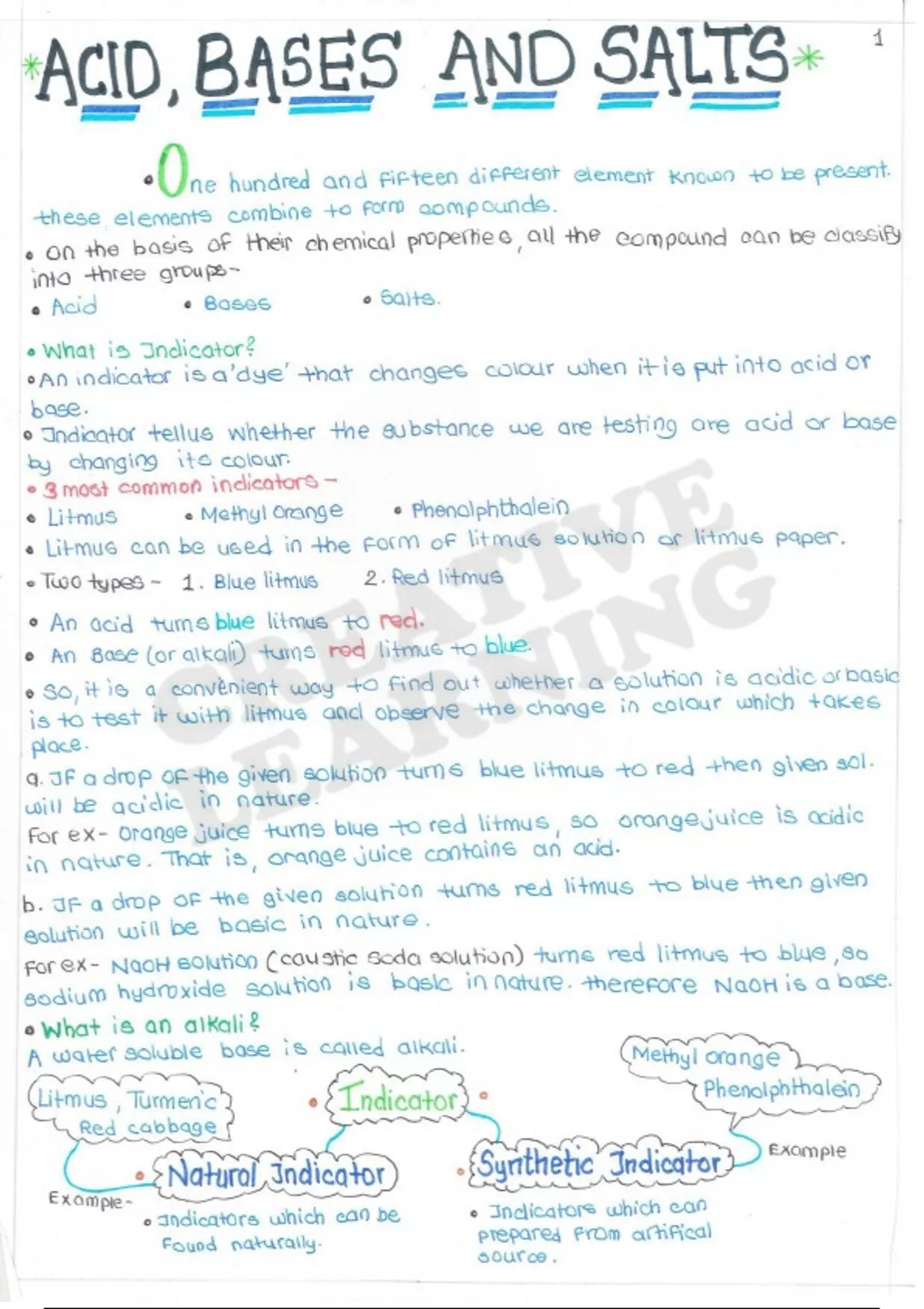 Sure, here's a short description of the "Acids, Bases, and Salts" chapter typically found in a Class 10 science curriculum: The "Acids, Bases, and Salts" chapter in Class 10 science introduces students to the fundamental concepts of acidity, basicity, and the properties of salts. It explores the nature and behavior of substances that are categorized as acids, bases, and salts, providing insight into their characteristics, chemical reactions, and real-world applications. In this chapter, students learn about acids, which are substances that release hydrogen ions (H⁺) when dissolved in water. Acids are known for their sour taste, ability to turn blue litmus paper red, and their role in reactions with metals to produce hydrogen gas. On the other hand, bases are substances that release hydroxide ions (OH⁻) when dissolved in water. Bases have a bitter taste, feel slippery to the touch, turn red litmus paper blue, and react with fats and oils to form soap. The chapter delves into the pH scale, a measurement of the acidity or basicity of a solution. It ranges from 0 to 14, with values less than 7 indicating acidity, values greater than 7 indicating basicity, and a pH of 7 being neutral. Students also learn about indicators, which are substances used to determine whether a solution is acidic, basic, or neutral. Litmus paper, phenolphthalein, and methyl orange are common indicators used to identify the nature of substances. Furthermore, the chapter covers the concept of salts, which are compounds formed by the reaction between acids and bases. Students discover how salts are named, based on the parent acid and base, and how their properties can differ based on their composition. The chapter provides examples of various applications of acids, bases, and salts in everyday life, such as the use of acids in food preservation and cleaning, the role of bases in agriculture and medicine, and the significance of salts in the food industry and in chemical processes. Overall, the "Acids, Bases, and Salts" chapter in Class 10 science equips students with a foundational understanding of these essential chemical concepts, fostering an appreciation for their significance in both natural phenomena and practical applications.
