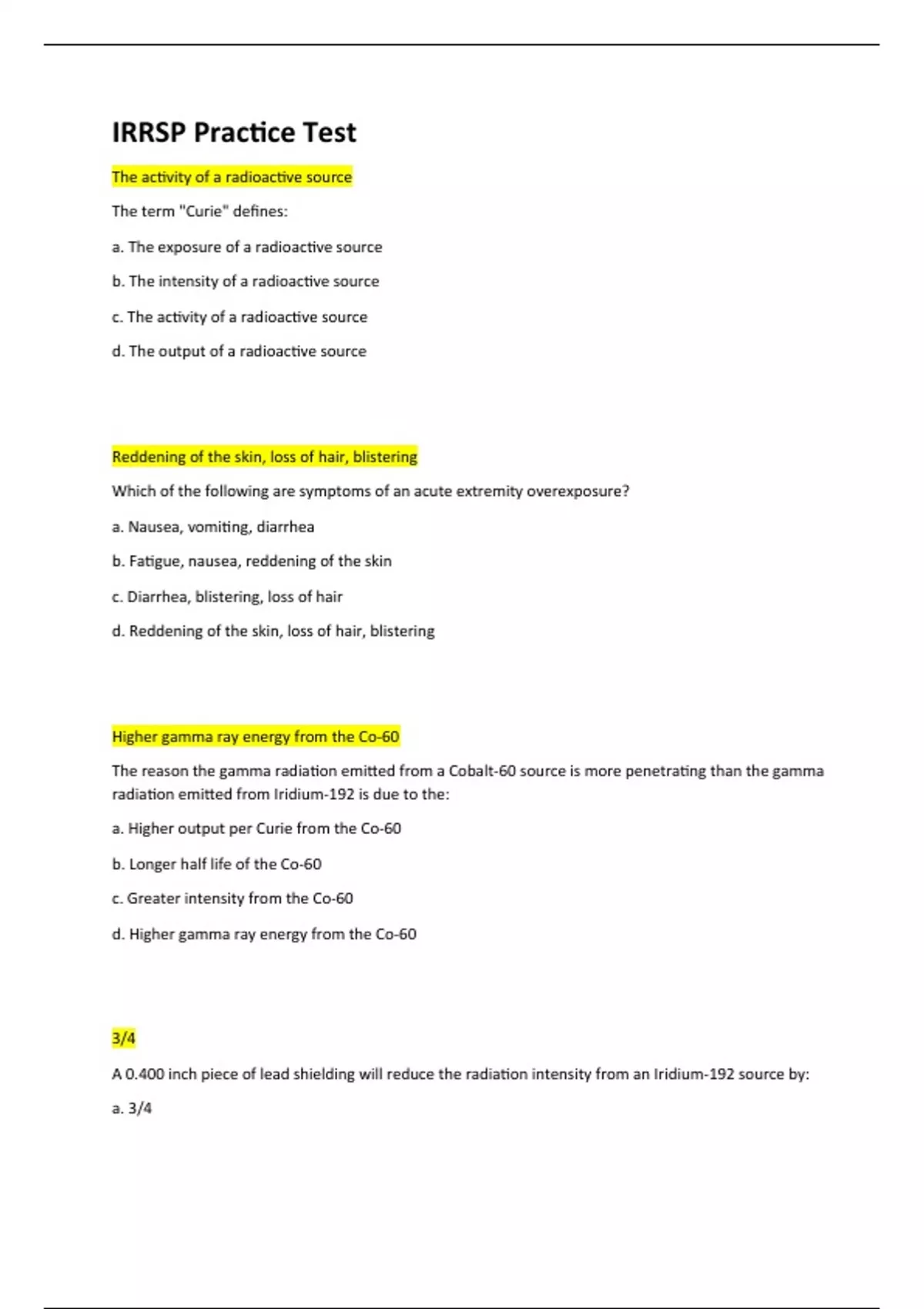 The activity of a radioactive source The term "Curie" defines: a. The exposure of a radioactive source b. The intensity of a radioactive source c. The activity of a radioactive source d. The output of a radioactive source Reddening of the skin, loss of hair, blistering Which of the following are symptoms of an acute extremity overexposure? a. Nausea, vomiting, diarrhea b. Fatigue, nausea, reddening of the skin c. Diarrhea, blistering, loss of hair d. Reddening of the skin, loss of hair, blistering
