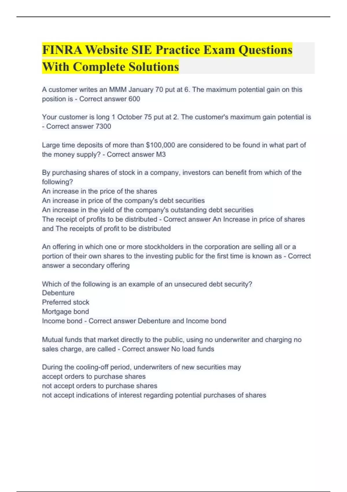 FINRA Website SIE Practice FINRA Website SIE Practice Exam Questions With Complete SolutionsExam Questions With Complete Solutions