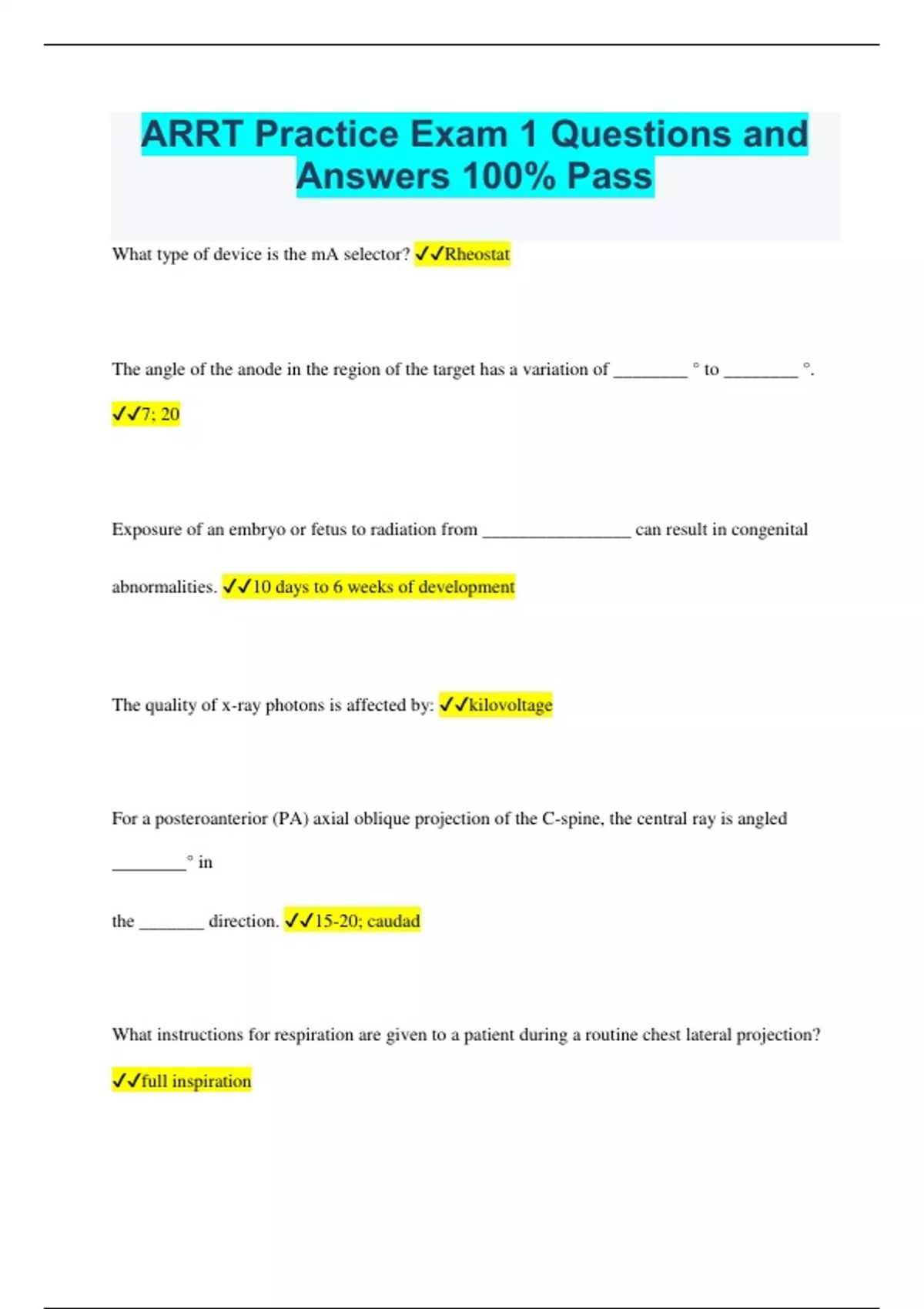 What type of device is the mA selector? Rheostat The angle of the anode in the region of the target has a variation of ________ ° to ________ °. 7; 20 Exposure of an embryo or fetus to radiation from ________________ can result in congenital abnormalities. 10 days to 6 weeks of development The quality of x-ray photons is affected by: kilovoltage For a posteroanterior (PA) axial oblique projection of the C-spine, the central ray is angled ________° in the _______ direction. 15-20; caudad What instructions for respiration are given to a patient during a routine chest lateral projection? full inspiration
