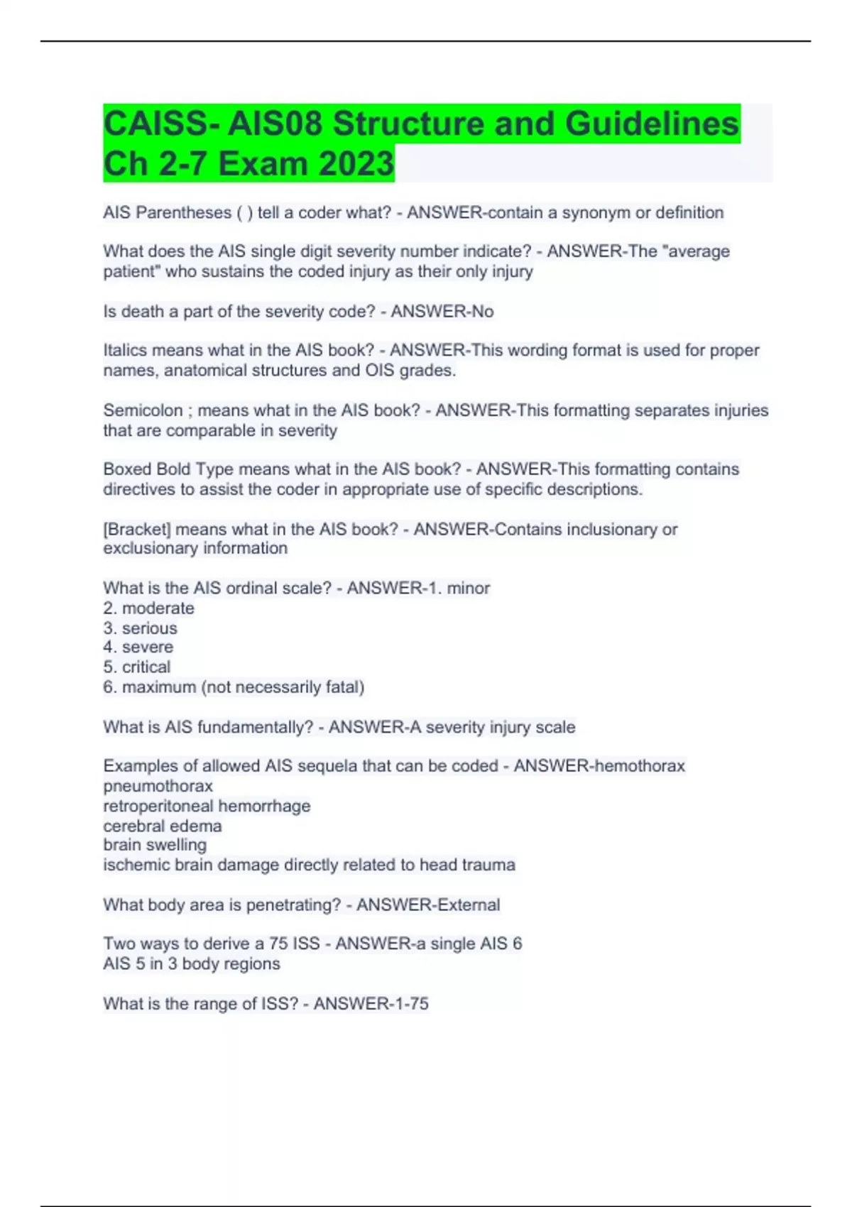 What is the AIS ordinal scale? - ANSWER-1. minor