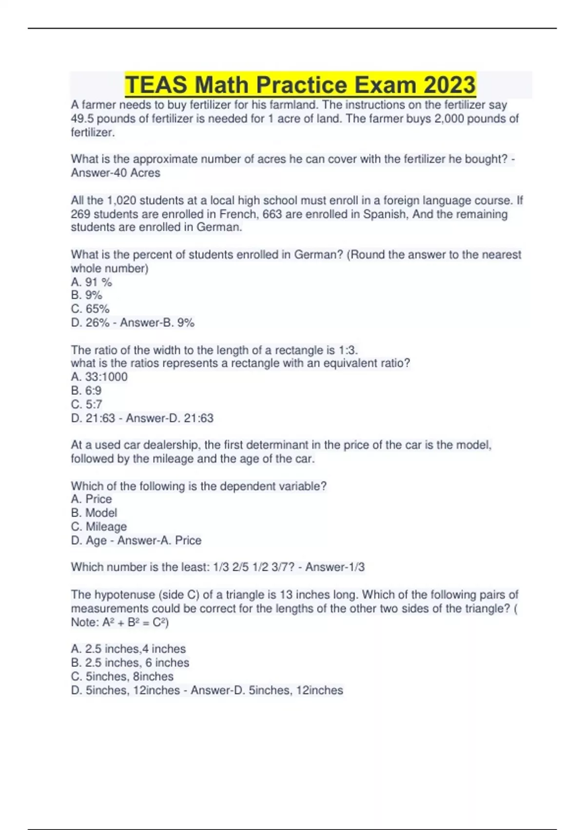 TEAS Math Practice Exam 2023 A farmer needs to buy fertilizer for his farmland. The instructions on the fertilizer say 49.5 pounds of fertilizer is needed for 1 acre of land. The farmer buys 2,000 pounds of fertilizer. What is the approximate number of acres he can cover with the fertilizer he bought? - Answer-40 Acres All the 1,020 students at a local high school must enroll in a foreign language course. If 269 students are enrolled in French, 663 are enrolled in Spanish, And the remaining students are enrolled in German. What is the percent of students enrolled in German? (Round the answer to the nearest whole number) A. 91 % B. 9% C. 65% D. 26% - Answer-B. 9% The ratio of the width to the length of a rectangle is 1:3. what is the ratios represents a rectangle with an equivalent ratio? A. 33:1000 B. 6:9 C. 5:7 D. 21:63 - Answer-D. 21:63 At a used car dealership, the first determinant in the price of the car is the model, followed by the mileage and the age of the car. Which of the following is the dependent variable? A. Price B. Model C. Mileage D. Age - Answer-A. Price Which number is the least: 1/3 2/5 1/2 3/7? - Answer-1/3 The hypotenuse (side C) of a triangle is 13 inches long. Which of the following pairs of measurements could be correct for the lengths of the other two sides of the triangle?... Continues...