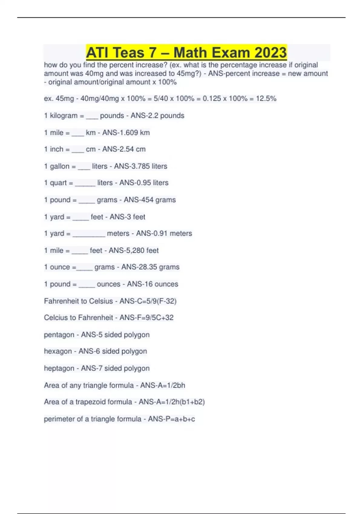 ATI Teas 7 – Math Exam 2023 how do you find the percent increase? (ex. what is the percentage increase if original amount was 40mg and was increased to 45mg?) - ANS-percent increase = new amount - original amount/original amount x 100% ex. 45mg - 40mg/40mg x 100% = 5/40 x 100% = 0.125 x 100% = 12.5% 1 kilogram = ___ pounds - ANS-2.2 pounds 1 mile = ___ km - ANS-1.609 km 1 inch = ___ cm - ANS-2.54 cm 1 gallon = ___ liters - ANS-3.785 liters 1 quart = _____ liters - ANS-0.95 liters 1 pound = ____ grams - ANS-454 grams 1 yard = ____ feet - ANS-3 feet 1 yard = ________ meters - ANS-0.91 meters 1 mile = ____ feet - ANS-5,280 feet 1 ounce =____ grams - ANS-28.35 grams 1 pound = ____ ounces - ANS-16 ounces Fahrenheit to Celsius - ANS-C=5/9(F-32) Celcius to Fahrenheit - ANS-F=9/5C+32 pentagon - ANS-5 sided polygon hexagon - ANS-6 sided polygon heptagon - ANS-7 sided polygon Area of any triangle formula - ANS-A=1/2bh Area of a trapezoid formula - ANS-A=1/2h(b1+b2) perimeter of a triangle formula - Continues...