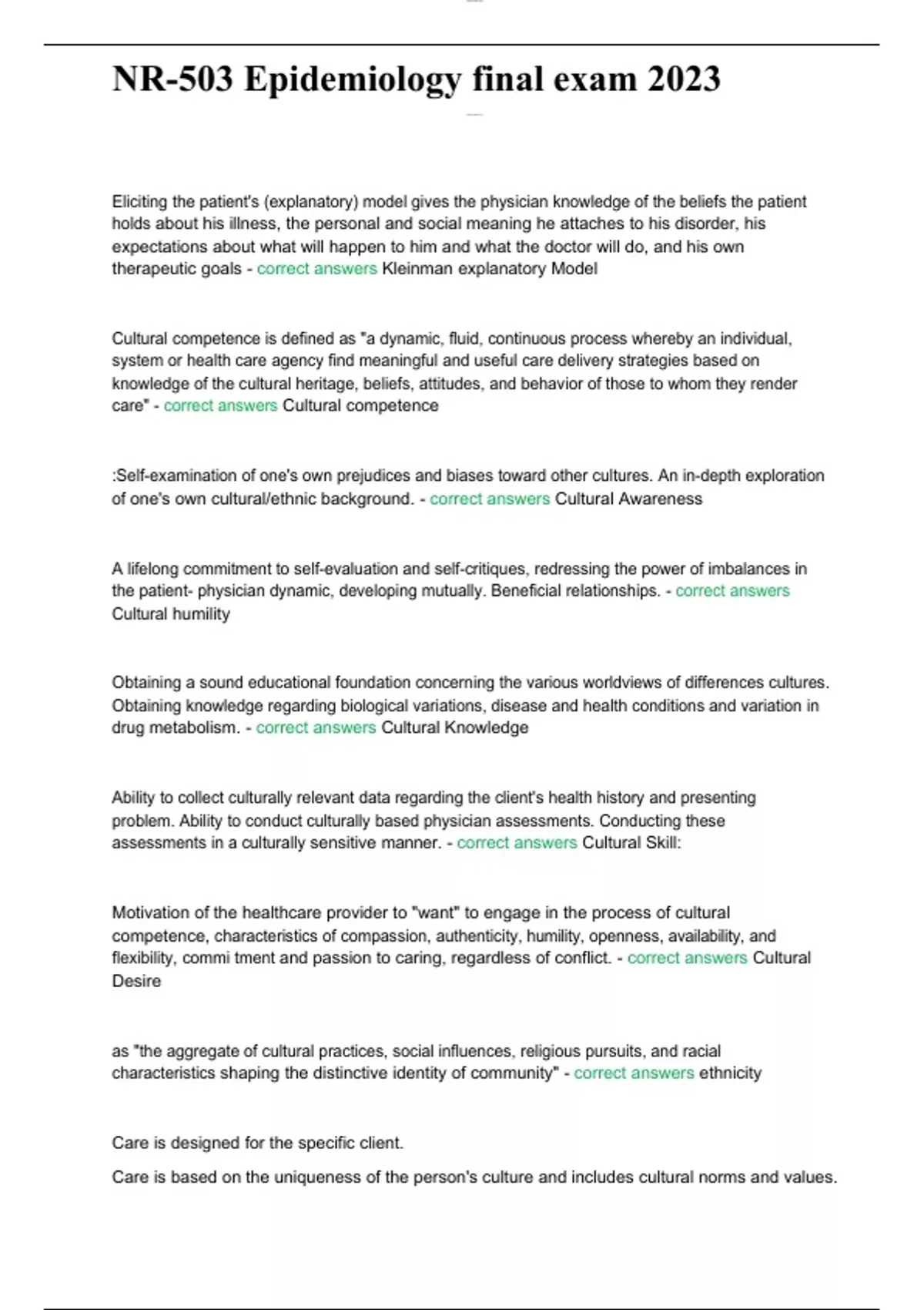 Kleinman explanatory Model - ANSWER Eliciting the patient's (explanatory) model gives the physician knowledge of the beliefs the patient holds about his illness, the personal and social meaning he attaches to his disorder, his expectations about what will happen to him and what the doctor will do, and his own therapeutic goals Cultural competence - ANSWER Cultural competence is defined as