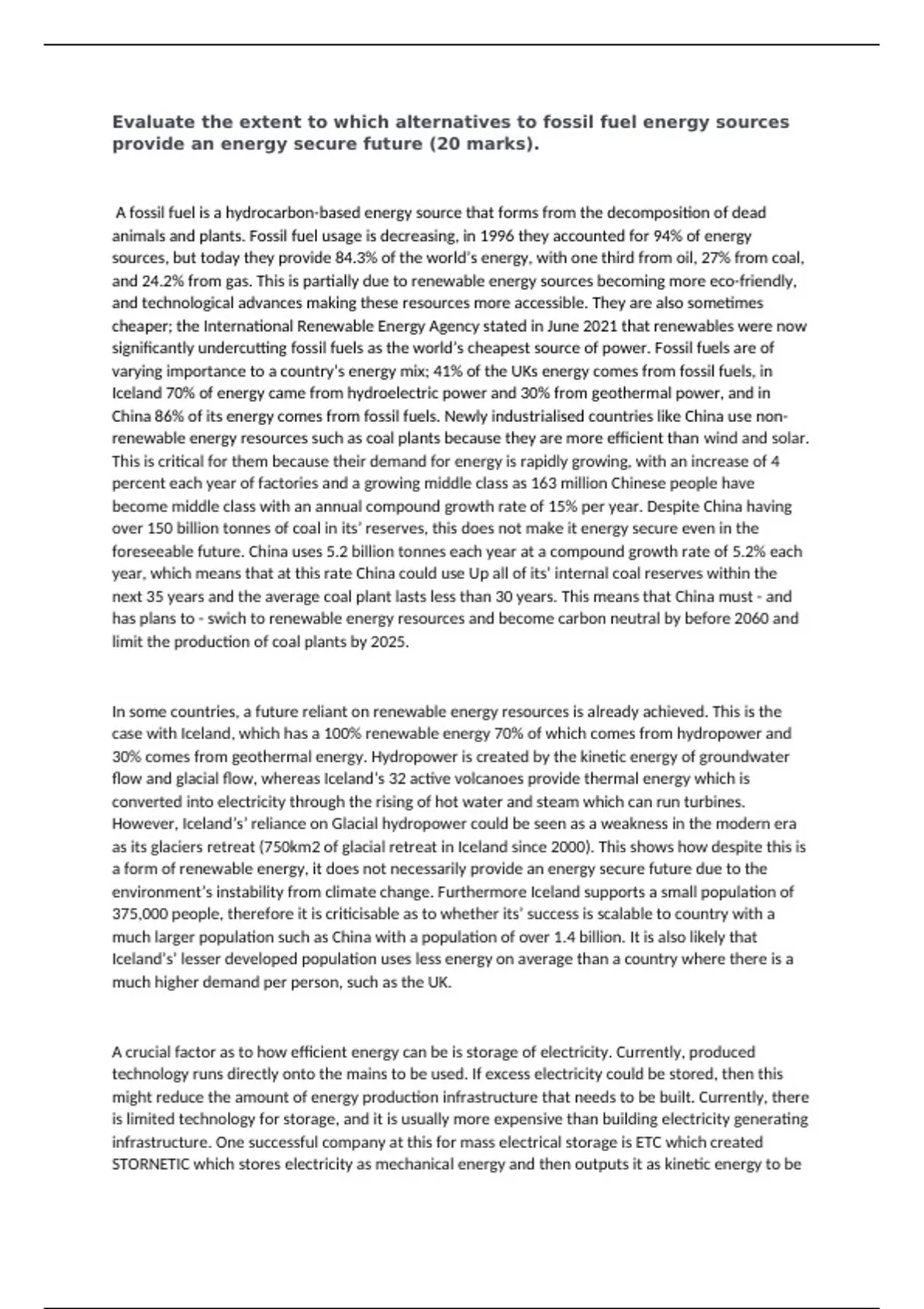 The 20 mark question is evaluate the extent to which alternatives to fossil fuel energy sources provide an energy secure future (20 marks). This document provides an answer which achieved full marks upon this question. It also is an example of a clear and transferable structure for any evaluate 20 mark geography question.