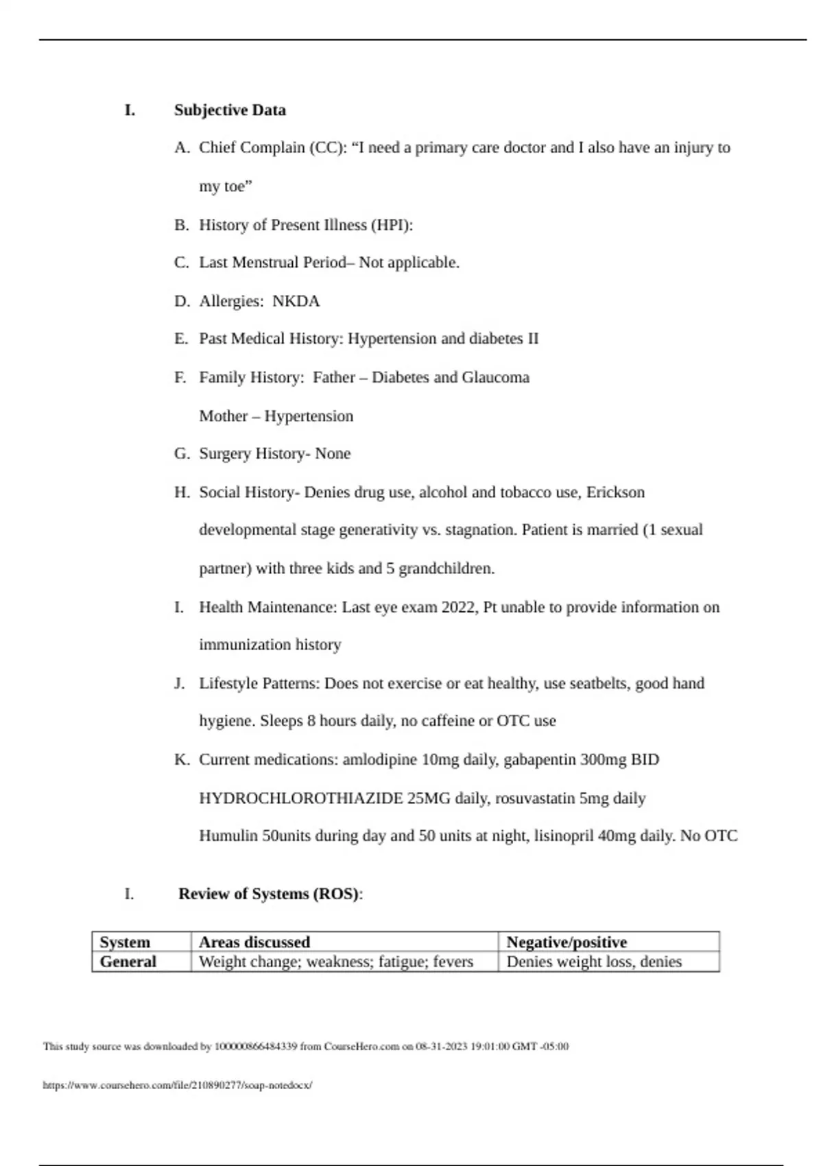 NURS 3150 soap note Fall 2023 Subjective Data A. Chief Complain (CC): “I need a primary care doctor and I also have an injury to my toe” B. History of Present Illness (HPI): C. Last Menstrual Period– Not applicable. D. Allergies: NKDA E. Past Medical History: Hypertension and diabetes II F. Family History: Father – Diabetes and Glaucoma Mother – Hypertension G. Surgery History- None H. Social History- Denies drug use, alcohol and tobacco use, Erickson developmental stage generativity vs. stagnation. Patient is married (1 sexual partner) with three kids and 5 grandchildren. I. Health Maintenance: Last eye exam 2022, Pt unable to provide information on immunization history J. Lifestyle Patterns: Does not exercise or eat healthy, use seatbelts, good hand hygiene. Sleeps 8 hours daily, no caffeine or OTC use K. Current medications: amlodipine 10mg daily, gabapentin 300mg BID HYDROCHLOROTHIAZIDE 25MG daily, rosuvastatin 5mg daily Humulin 50units during day and 50 units at night, lisinopril 40mg daily. No OTC