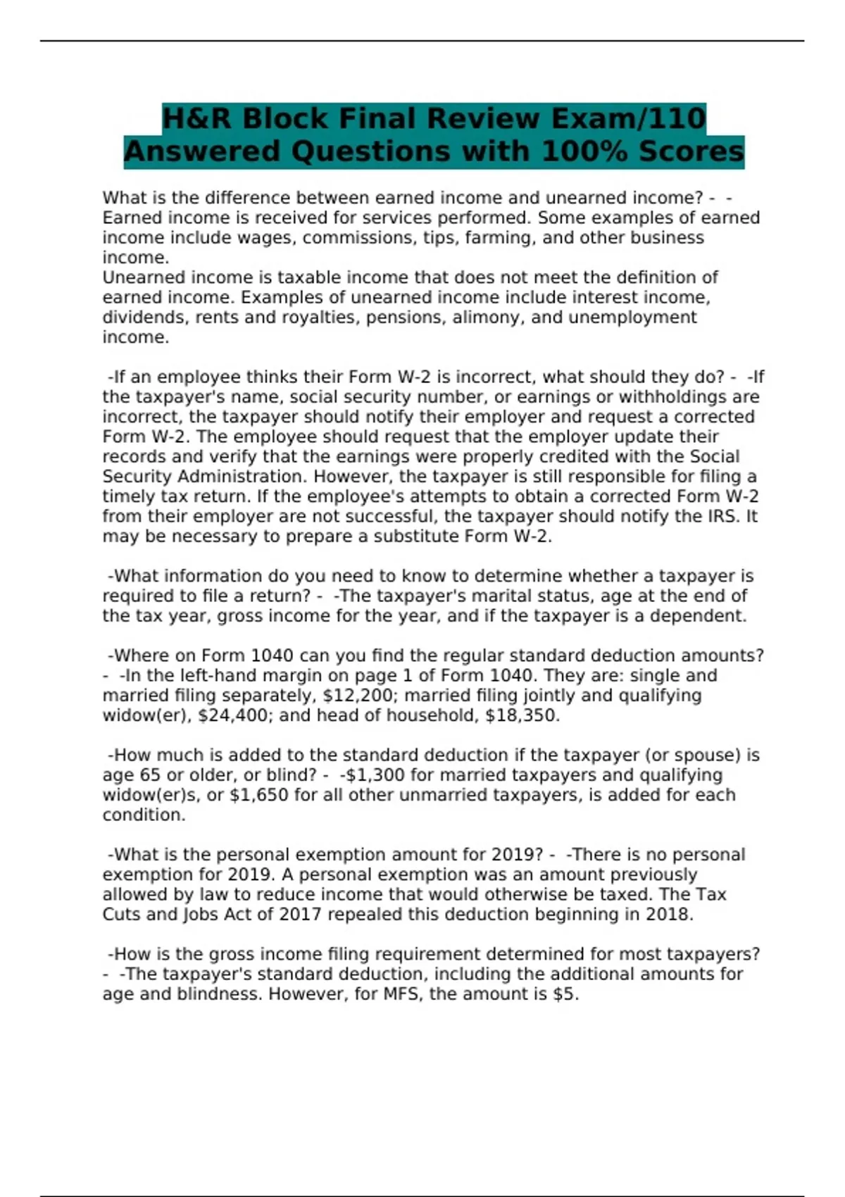 H&R Block Final Review Exam/110 Answered Questions with 100% Scores