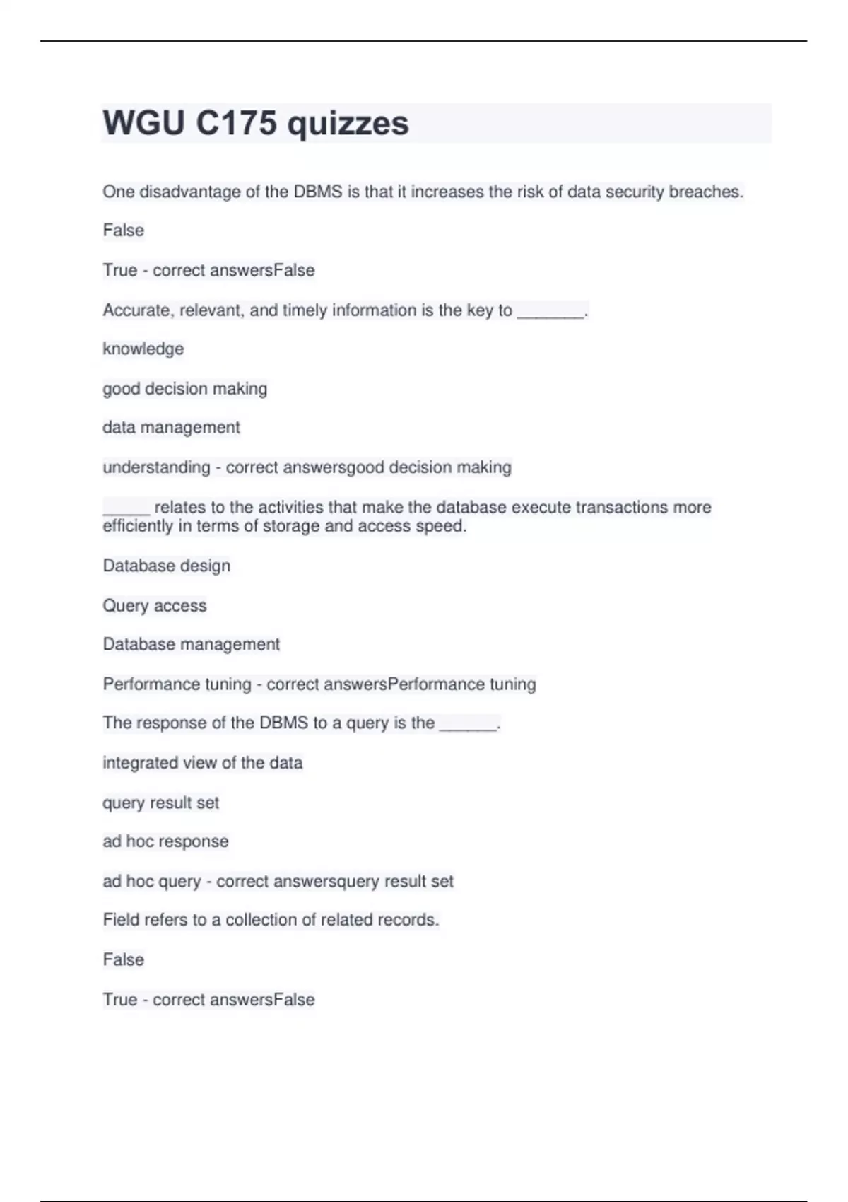 WGU C175 quizzes One disadvantage of the DBMS is that it increases the risk of data security breaches. False True - correct answersFalse Accurate, relevant, and timely information is the key to _______. knowledge good decision making data management understanding - correct answersgood decision making _____ relates to the activities that make the database execute transactions more efficiently in terms of storage and access speed. Database design Query access Database management Performance tuning - correct answersPerformance tuning The response of the DBMS to a query is the ______. integrated view of the data query result set ad hoc response ad hoc query - correct answersquery result set Field refers to a collection of related records. False True - correct answersFalse The DBMS uses the ________ to look up the required data component structures and relationships, thus relieving programmers from having to code such complex relationships in each program. - correct answersdata dictionary A(n) ________ is a collection of programs that manages the database structure and controls access to the data stored in the database. - correct answersdatabase management system A _____ is a character or group of characters that has a specific meaning. file record field database - correct answersfield Data warehouse contains historical data obtained from the_____. desktop database enterprise databases workgroup databases operational databases - correct answersoperational databases