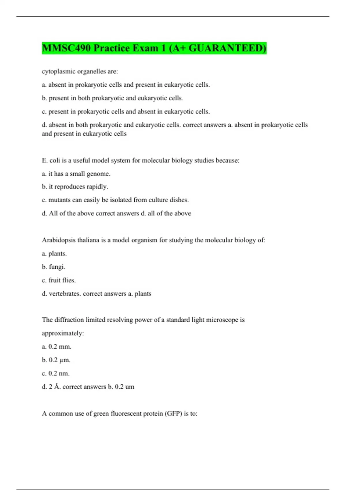 cytoplasmic organelles are: a. absent in prokaryotic cells and present in eukaryotic cells. b. present in both prokaryotic and eukaryotic cells. c. present in prokaryotic cells and absent in eukaryotic cells. d. absent in both prokaryotic and eukaryotic cells. correct answers a. absent in prokaryotic cells and present in eukaryotic cells E. coli is a useful model system for molecular biology studies because: a. it has a small genome. b. it reproduces rapidly. c. mutants can easily be isolated from culture dishes. d. All of the above correct answers d. all of the above Arabidopsis thaliana is a model organism for studying the molecular biology of: a. plants. b. fungi. c. fruit flies. d. vertebrates. correct answers a. plants The diffraction limited resolving power of a standard light microscope is approximately: a. 0.2 mm. b. 0.2 µm. c. 0.2 nm. d. 2 Å. correct answers b. 0.2 um A common use of green fluorescent protein (GFP) is to: