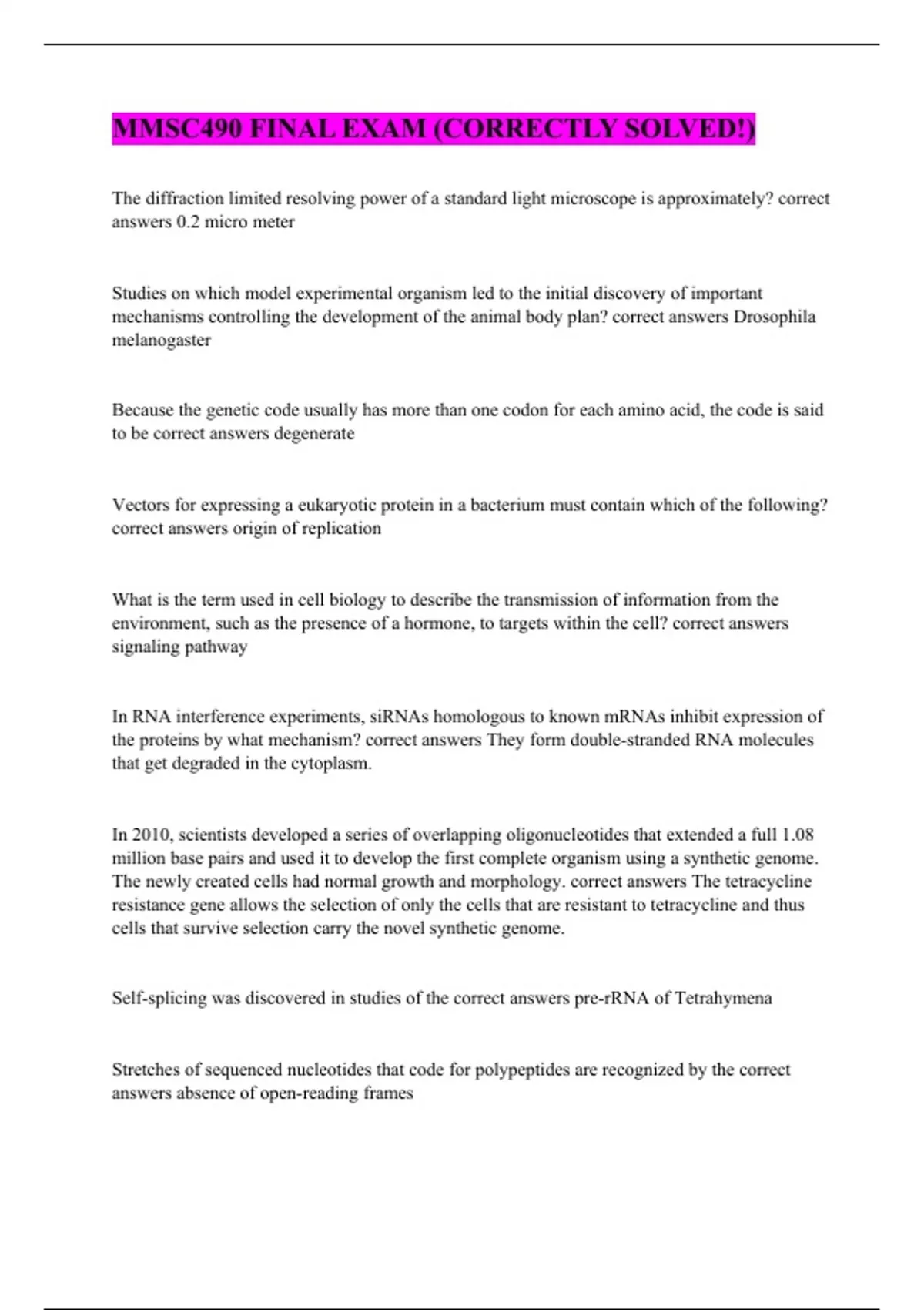 The diffraction limited resolving power of a standard light microscope is approximately? correct answers 0.2 micro meter Studies on which model experimental organism led to the initial discovery of important mechanisms controlling the development of the animal body plan? correct answers Drosophila melanogaster Because the genetic code usually has more than one codon for each amino acid, the code is said to be correct answers degenerate Vectors for expressing a eukaryotic protein in a bacterium must contain which of the following? correct answers origin of replication What is the term used in cell biology to describe the transmission of information from the environment, such as the presence of a hormone, to targets within the cell? correct answers signaling pathway In RNA interference experiments, siRNAs homologous to known mRNAs inhibit expression of the proteins by what mechanism? correct answers They form double-stranded RNA molecules that get degraded in the cytoplasm. In 2010, scientists developed a series of overlapping oligonucleotides that extended a full 1.08 million base pairs and used it to develop the first complete organism using a synthetic genome. The newly created cells had normal growth and morphology. correct answers The tetracycline resistance gene allows the selection of only the cells that are resistant to tetracycline and thus cells that survive selection carry the novel synthetic genome. Self-splicing was discovered in studies of the correct answers pre-rRNA of Tetrahymena Stretches of sequenced nucleotides that code for polypeptides are recognized by the correct answers absence of open-reading frames