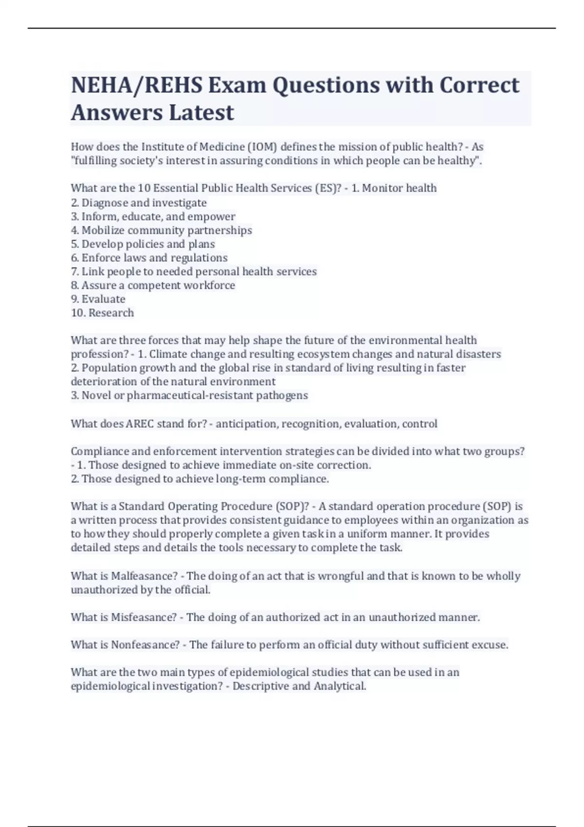 NEHA/REHS Exam Questions with Correct Answers Latest How does the Institute of Medicine (IOM) defines the mission of public health? - As "fulfilling society's interest in assuring conditions in which people can be healthy". What are the 10 Essential Public Health Services (ES)? - 1. Monitor health 2. Diagnose and investigate 3. Inform, educate, and empower 4. Mobilize community partnerships 5. Develop policies and plans 6. Enforce laws and regulations 7. Link people to needed personal health services 8. Assure a competent workforce 9. Evaluate 10. Research What are three forces that may help shape the future of the environmental health profession? - 1. Climate change and resulting ecosystem changes and natural disasters 2. Population growth and the global rise in standard of living resulting in faster deterioration of the natural environment 3. Novel or pharmaceutical-resistant pathogens What does AREC stand for? - anticipation, recognition, evaluation, control Compliance and enforcement intervention strategies can be divided into what two groups? - 1. Those designed to achieve immediate on-site correction. 2. Those designed to achieve long-term compliance. What is a Standard Operating Procedure (SOP)? - A standard operation procedure (SOP) is a written process that provides consistent guidance to employees within an organization as to how they should properly complete a given task in a uniform manner. It provides detailed steps and details the tools necessary to complete the task. What is Malfeasance? - The doing of an act that is wrongful and that is known to be wholly unauthorized by the official. What is Misfeasance? - The doing of an authorized act in an unauthorized manner. What is Nonfeasance? - The failure to perform an official duty without sufficient excuse. What are the two main types of epidemiological studies that can be used in an epidemiological investigation? - Descriptive and Analytical. Active Immunity - Results when exposure to a disease organism triggers the immune system to produce antibodies to that disease. Active immunity can be acquired through natural immunity or vaccine-induced immunity Passive Immunity - When a person is given antibodies to a disease rather than producing them through his or her own immune system. Agent (biology/epi) - A factor (e.g., a microorganism or chemical substance) or form of energy whose presence, excessive presence, or in the case of deficiency diseases, relative absence is essential for the occurrence of a disease or other adverse health outcome. Mode of Transmission - The manner in which an agent is transmitted from its reservoir to a susceptible host. Carrier - A person or animal that harbors the infectious agent for a disease and can transmit it to others, but does not demonstrate signs of the disease. A carrier can be asymptomatic (never indicate signs of the disease) or can display signs of the disease only during the incubation period, convalescence, or postconvalescence. The period of being a carrier can be short (a transient carrier) or long (a chronic carrier). Morbidity - (disease) Any departure, subjective or objective, from a state of physiological or psychological health and well-being. Mortality - Death Demographic Information - Personal characteristics of a person or group (e.g., age, sex, race/ethnicity, residence, and occupation) demographic information is used in descriptive epidemiology to characterize patients or populations. Pandemic - An epidemic occurring over a widespread area (multiple countries or continents) and usually affecting a substantial proportion of the population. Endemic - The constant presence of an agent or health condition within a given geographic area or population; can also refer to the usual prevalence of an agent or condition. Epidemic - The occurrence of more cases of disease, injury, or other health condition than expected in a given area or among a specific group of persons during a particular period. Usually, the cases are presumed to have a common cause or to be related to one another in some way. Frequency - The amount or number of occurrences of an attribute or health outcome among a population. Portal of Entry - A pathway into the host that gives an agent access to tissue that will allow it to multiply or act. Prevalence - The number or proportion of cases or events or attributes among a given population. Host - A person or other living organism that is susceptible to or harbors an infectious agent under natural conditions. Reservoir - The habitat in which an infectious agent normally lives, grows, and multiplies, which can include humans, animals, or the environment. Descriptive Epidemiology - The aspect of epidemiology concerned with organizing and summarizing data regarding the persons affected (e.g., the characteristics of those who became ill), time (e.g., when they become ill), and place (e.g., where they might have been exposed to the cause of illness). Applied Epidemiology - The application or practice of epidemiology to control and prevent health problems. Lag Phase - The period of time between the introduction of a microorganism into a culture medium and the time it begins to increase exponentially Physical factors - Examples include geology and climate, harmful substances, such as air pollution or proximity to toxic sites (the focus of classic environmental epidemiology); access to various health-related resources (e.g., healthy or unhealthy foods, recreational resources, medical care); and community design and the "built environment" (e.g., land use mix, street connectivity, transportation systems). Log phase (growth phase) - The period of growth of a population of cells (as of a microorganism) in a culture medium during which numbers increase exponentially and which is represented by a part of the growth curve that is a straight line segment if the logarithm of numbers is plotted against time Equal Protection - A right guaranteed by the Bill of Rights requiring the co