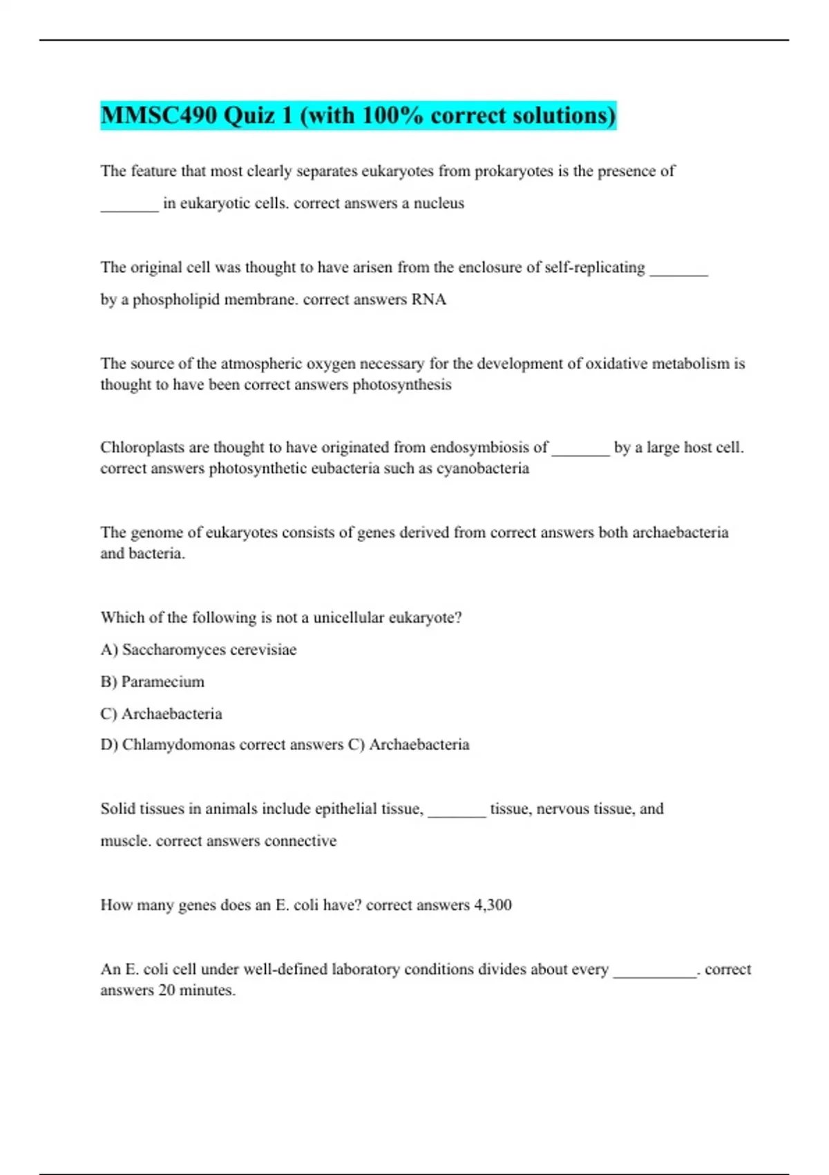 The feature that most clearly separates eukaryotes from prokaryotes is the presence of _______ in eukaryotic cells. correct answers a nucleus The original cell was thought to have arisen from the enclosure of self-replicating _______ by a phospholipid membrane. correct answers RNA The source of the atmospheric oxygen necessary for the development of oxidative metabolism is thought to have been correct answers photosynthesis Chloroplasts are thought to have originated from endosymbiosis of _______ by a large host cell. correct answers photosynthetic eubacteria such as cyanobacteria The genome of eukaryotes consists of genes derived from correct answers both archaebacteria and bacteria. Which of the following is not a unicellular eukaryote? A) Saccharomyces cerevisiae B) Paramecium C) Archaebacteria D) Chlamydomonas correct answers C) Archaebacteria Solid tissues in animals include epithelial tissue, _______ tissue, nervous tissue, and muscle. correct answers connective How many genes does an E. coli have? correct answers 4,300 An E. coli cell under well-defined laboratory conditions divides about every __________. correct answers 20 minutes.