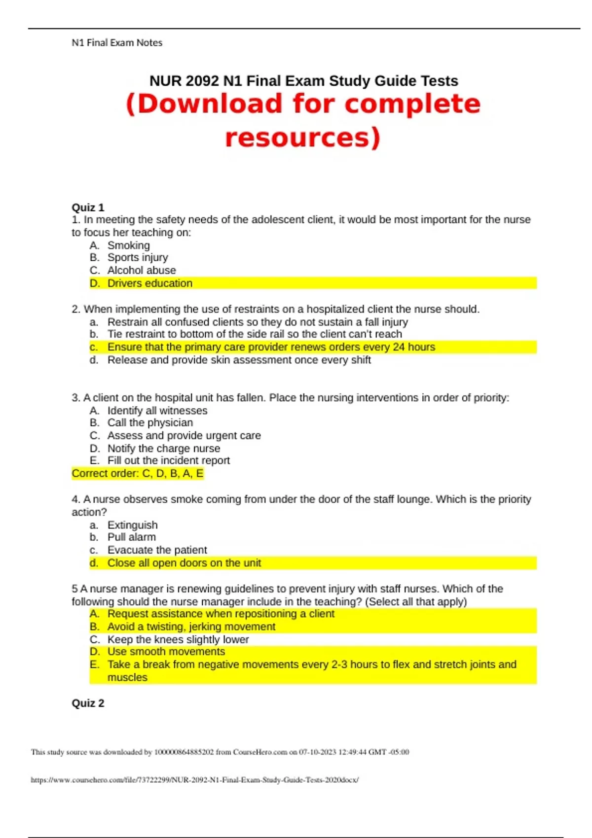 NUR 2092 N1 Final Exam Study Guide Tests 2023