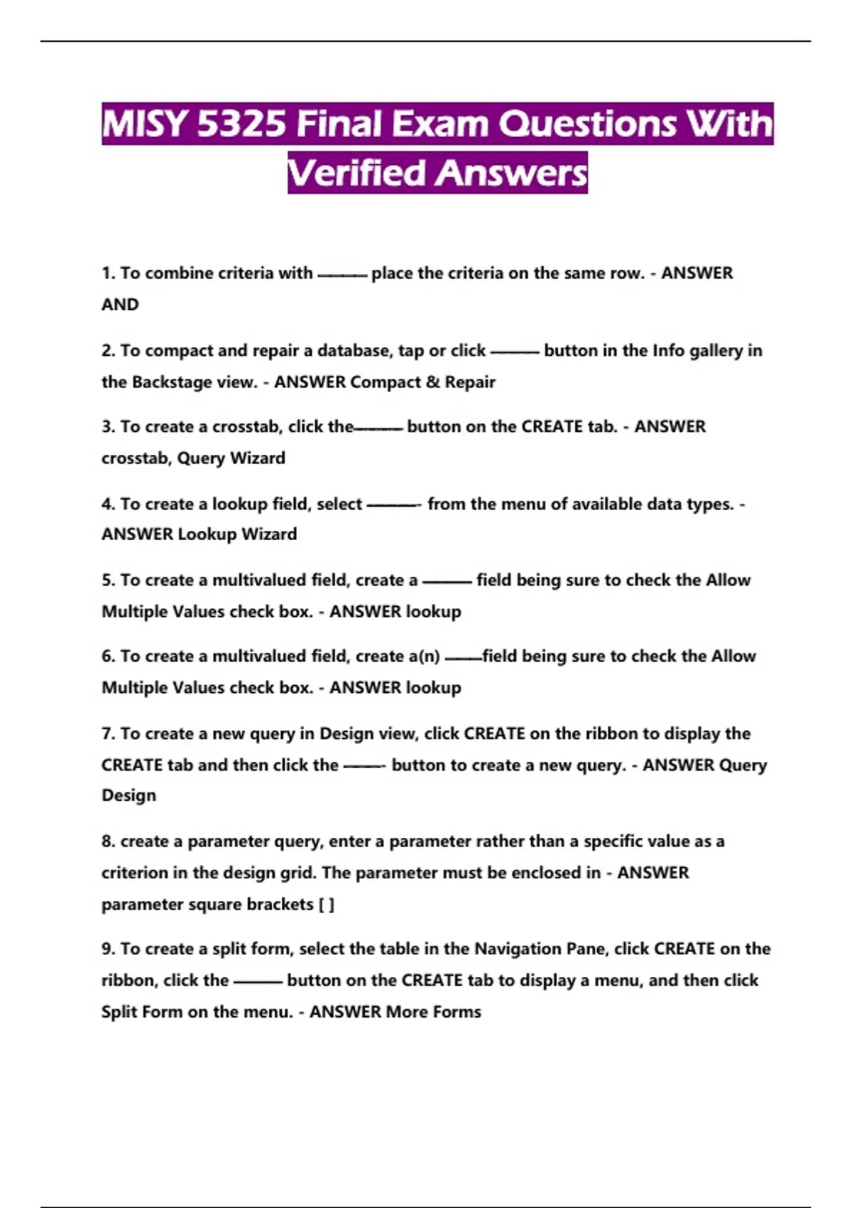 MISY 532 5 Final Exam Q uestions W ith Verified A nswers 1. To combine criteria with ———— place the criteria on the same row. - ANSWER AND 2. To compact and repair a database, tap or click ———— button in the Info gallery in the Backstage view. - ANSWER Compact & Repair 3. To create a crosstab, click the ———— button on the CREATE tab. - ANSWER crosstab, Query Wizard 4. To create a lookup field, select ————- from the menu of available data types. - ANSWER Lookup Wizard 5. To create a multivalued field, create a ———— field being sure to check the Allow Multiple Values check box. - ANSWER lookup 6. To create a multivalued field, create a(n) ———field being sure to check the Allow Multiple Values check box. - ANSWER lookup 7. To create a new query in Design view, click CREATE on the ribbon to di splay the CREATE tab and then click the ———- button to create a new query. - ANSWER Query Design 8. create a parameter query, enter a parameter rather than a specific value as a criterion in the design grid. The parameter must be enclosed in - ANSWER parameter square brackets [ ] 9. To create a split form, select the table in the Navigation Pane, click CREATE on the ribbon, click the ———— button on the CREATE tab to display a menu, and then click Split Form on the menu. - ANSWER More Forms 10. To create a top-values query, use the Top Values box on the DESIGN tab to change the number of records to be included from All to the desired number. - ANSWER False 11. To create a validation rule for the State field to restrict entries to TN or TX, enter ————in the Validation Rule property box. - ANSWER T 12. To create an update query, create a new query and then click the ———- button on the DESIGN tab. - ANSWER Update 13. To define an additional field in Datasheet view, tap or click the ———- column heading. - ANSWER Click to Add 14. To define an additional field in Datasheet view, tap or click the ———— column heading, select the data type, and then type the field name. - ANSWER Click to Add 15. To delete a database object, press and hold or right-click the object in th e Navigation Pane and then tap or click ———- on the shortcut menu. - ANSWER Delete 16. To delete a field from a table, open the table in ———- view, click the row selector for the field to be deleted, and then press the DELETE key. - ANSWER Answer: Design 17. To delete a field in a table, press and hold or right-click the column heading for the field, and then tap or click ————-on the shortcut menu. - ANSWER Delete Field 18. To delete a field, press and hold or right-click the column heading for the field, and then tap or click Remove Field on the shortcut menu. T/F - ANSWER Fals e 19. To delete a record, tap or click the record selector for the record, and then press the key(s). - ANSWER DELETE 20. To display the Total row in a datasheet, click the Sum button on the rib bon. Torf - ANSWER False 21. To enter a number in a criterion, type the number without any dollar s igns or
