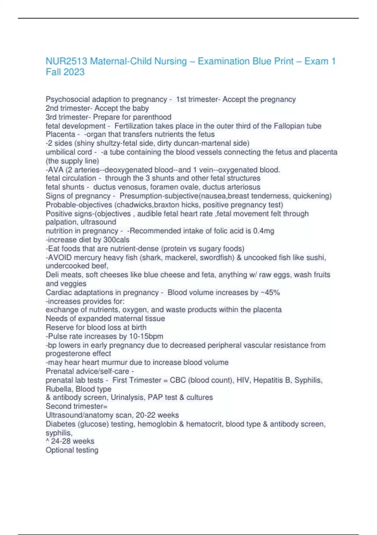 NUR2513 Maternal-Child Nursing – Examination Blue Print – Exam 1 Fall 2023 Psychosocial adaption to pregnancy - 1st trimester- Accept the pregnancy 2nd trimester- Accept the baby 3rd trimester- Prepare for parenthood fetal development - Fertilization takes place in the outer third of the Fallopian tube Placenta - -organ that transfers nutrients the fetus -2 sides (shiny shultzy-fetal side, dirty duncan-martenal side) umbilical cord - -a tube containing the blood vessels connecting the fetus and placenta (the supply line) -AVA (2 arteries--deoxygenated blood--and 1 vein--oxygenated blood. fetal circulation - through the 3 shunts and other fetal structures fetal shunts - ductus venosus, foramen ovale, ductus arteriosus Signs of pregnancy - Presumption-subjective(nausea,breast tenderness, quickening) Probable-objectives (chadwicks,braxton hicks, positive pregnancy test) Positive signs-(objectives , audible fetal heart rate ,fetal movement felt through palpation, ultrasound nutrition in pregnancy - -Recommended intake of folic acid is 0.4mg -increase diet by 300cals -Eat foods that are nutrient-dense (protein vs sugary foods) -AVOID mercury heavy fish (shark, mackerel, swordfish) & uncooked fish like sushi, undercooked beef, Deli meats, soft cheeses like blue cheese and feta, anything w/ raw eggs, wash fruits and veggies Cardiac adaptations in pregnancy - Blood volume increases by ~45% -increases provides for: exchange of nutrients, oxygen, and waste products within the placenta Needs of expanded maternal tissue Reserve for blood loss at birth -Pulse rate increases by 10-15bpm -bp lowers in early pregnancy due to decreased peripheral vascular resistance from progesterone effect -may hear heart murmur due to increase blood volume Prenatal advice/self-care - prenatal lab tests - First Trimester = CBC (blood count), HIV, Hepatitis B, Syphilis, Rubella, Blood type & antibody screen, Urinalysis, PAP test & cultures Second trimester= Ultrasound/anatomy scan, 20-22 weeks Diabetes (glucose) testing, hemoglobin & hematocrit, blood type & antibody screen, syphilis, ^ 24-28 weeks Optional testing MS-AFP or quad screen, 15-22 weeks (testing to screen for genetic disorders, e.g. Down syndrome, or neural tube defects, e.g. spina bifida) Third trimester= Group-B Streptococcus (GBS) approximately 35-37 weeks prenatal weight gain - -Normal weight gain 25-35 pounds -First trimester 3-4 pounds. 1 pound / week after Nonstress test - -A method for evaluating fetal status during the antepartum period by observing the response of the fetal heart rate to fetal movement. -Client presses a button whenever they feel fetal movement which allows nurse to assess FHR in relationship to the fetal movement MSAFP - Maternal alpha serum protein test performed around 16-20wks for screening purposes; elevated levels may indicate neural tube defect (NFT) (conduct ultrasound to diagnose)