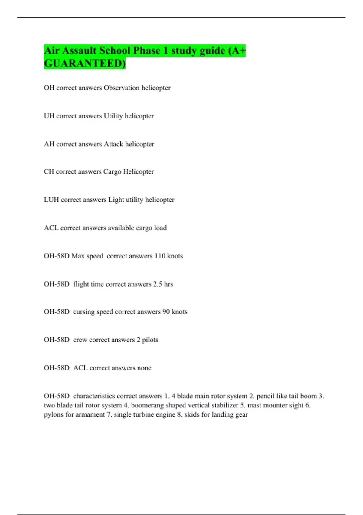 OH correct answers Observation helicopter UH correct answers Utility helicopter AH correct answers Attack helicopter CH correct answers Cargo Helicopter LUH correct answers Light utility helicopter ACL correct answers available cargo load OH-58D Max speed correct answers 110 knots OH-58D flight time correct answers 2.5 hrs OH-58D cursing speed correct answers 90 knots OH-58D crew correct answers 2 pilots OH-58D ACL correct answers none OH-58D characteristics correct answers 1. 4 blade main rotor system 2. pencil like tail boom 3. two blade tail rotor system 4. boomerang shaped vertical stabilizer 5. mast mounter sight 6. pylons for armament 7. single turbine engine 8. skids for landing gear