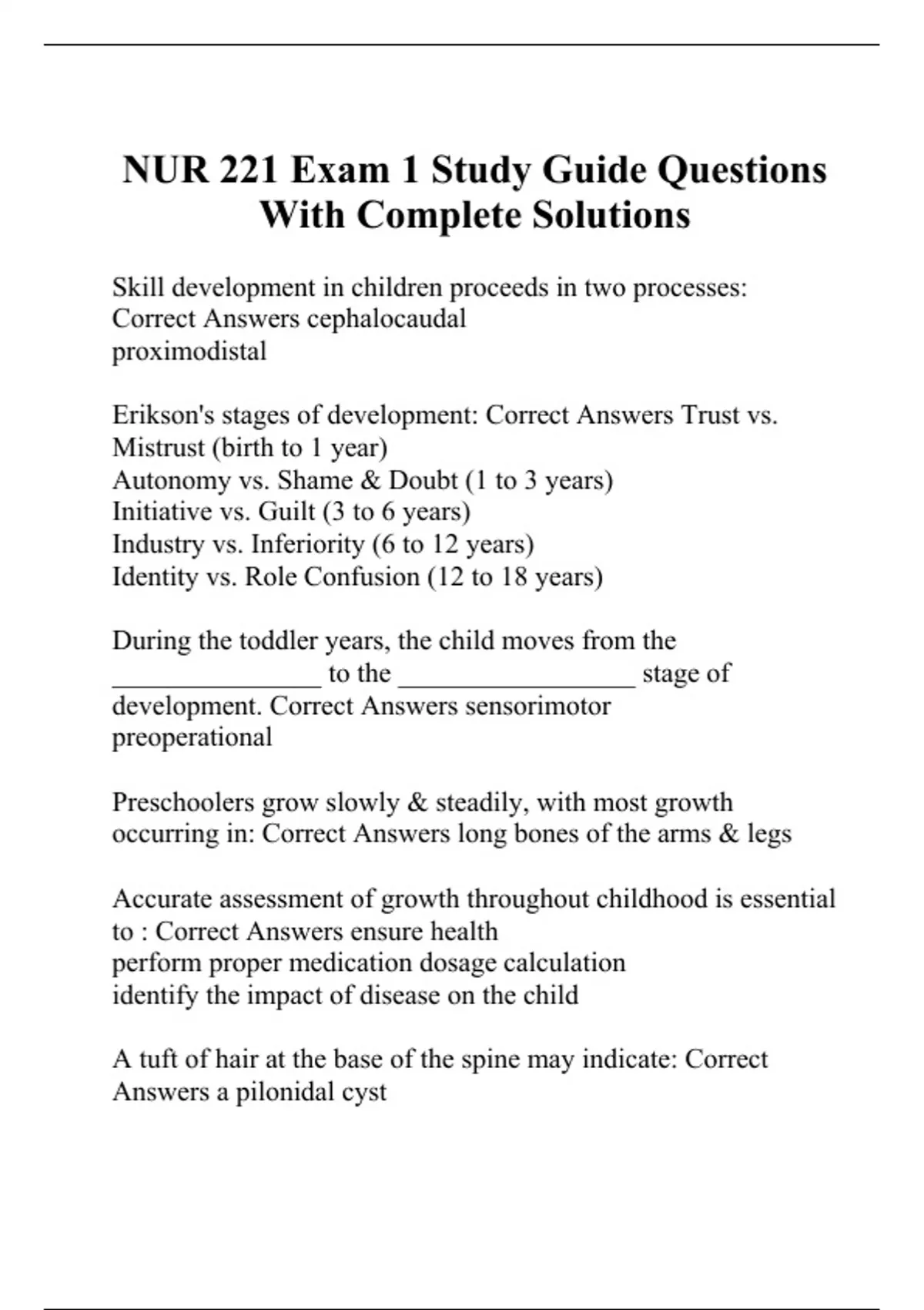 Skill development in children proceeds in two processes: Correct Answers cephalocaudal proximodistal Erikson's stages of development: Correct Answers Trust vs. Mistrust (birth to 1 year) Autonomy vs. Shame & Doubt (1 to 3 years) Initiative vs. Guilt (3 to 6 years) Industry vs. Inferiority (6 to 12 years) Identity vs. Role Confusion (12 to 18 years) During the toddler years, the child moves from the _______________ to the _________________ stage of development. Correct Answers sensorimotor preoperational Preschoolers grow slowly & steadily, with most growth occurring in: Correct Answers long bones of the arms & legs Accurate assessment of growth throughout childhood is essential to : Correct Answers ensure health perform proper medication dosage calculation identify the impact of disease on the child A tuft of hair at the base of the spine may indicate: Correct Answers a pilonidal cyst An unusually low hairline on the neck or forehead may indicate: Correct Answers a congenital disorder (ex. hypothyroidism) Significant facial asymmetry may result from: Correct Answers paralysis of trigeminal or facial nerves in utero positioning swelling r/t infection/allergy/trauma A shift of the trachea from the midline may indicate: Correct Answers tumor collapsed lung The primary breathing muscle in infants & children under 6 years: Correct Answers diaphragm Heart murmurs are classified by: Correct Answers intensity location radiation timing quality In infants and young children, the most important pulses to evaluate: Correct Answers femoral brachial The group most at-risk for a stressful experience as a result of hospitalization: Correct Answers toddlers Common stressors for the hospitalized toddler: Correct Answers parental separation schedule disruption fear of pain fear of invasive procedures