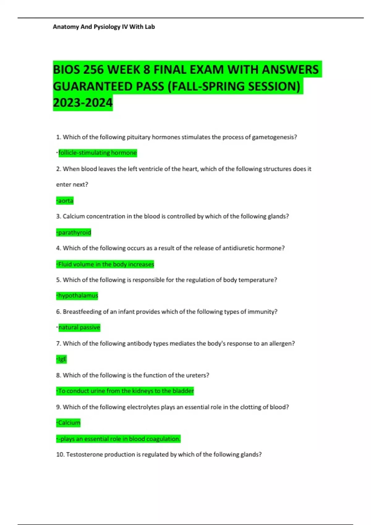BIOS 256 WEEK 8 FINAL EXAM WITH ANSWERS GUARANTEED PASS (FALL-SPRING SESSION)