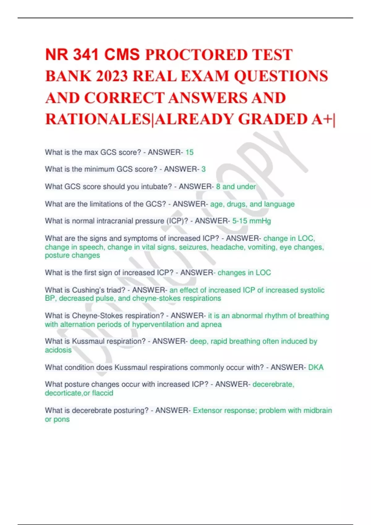 NR 341 CMS PROCTORED TEST BANK 2023 REAL EXAM QUESTIONS AND CORRECT ANSWERS AND RATIONALES|ALREADY GRADED A+| What is the max GCS score? - ANSWER- 15 What is the minimum GCS score? - ANSWER- 3 What GCS score should you intubate? - ANSWER- 8 and under What are the limitations of the GCS? - ANSWER- age, drugs, and language What is normal intracranial pressure (ICP)? - ANSWER- 5-15 mmHg What are the signs and symptoms of increased ICP? - ANSWER- change in LOC, change in speech, change in vital signs, seizures, headache, vomiting, eye changes, posture changes What is the first sign of increased ICP? - ANSWER- changes in LOC What is Cushing’s triad? - ANSWER- an effect of increased ICP of increased systolic BP, decreased pulse, and cheyne-stokes respirations What is Cheyne-Stokes respiration? - ANSWER- it is an abnormal rhythm of breathing with alternation periods of hyperventilation and apnea What is Kussmaul respiration? - ANSWER- deep, rapid breathing often induced by acidosis What condition does Kussmaul respirations commonly occur with? - ANSWER- DKA What posture changes occur with increased ICP? - ANSWER- decerebrate, decorticate,or flaccid What is decerebrate posturing? - ANSWER- Extensor response; problem with midbrain or pons What is decorticate posturing? - ANSWER- Flexor response; problem with cervical spinal tract or cerebral hemisphere What are the eye changes that occur with increased ICP? - ANSWER- papilledema, pupillary changes, impaired eye movement What is a common cause of increased brain volume? - ANSWER- cerebral edema; can also be caused by a tumor or meningitis What causes increased blood volume? - ANSWER- loss of auto-regulation, decreased oxygenation, hypercapnia, increased metabolic demands, and obstruction of venous outflow What causes increased cerebrospinal fluid? - ANSWER- hydrocephalus, blockage of normal flow, obstruction of normal re-absorption, and excess production of CSF What is cerebral perfusion pressure (CPP) dependent upon? - ANSWER- intracranial pressure (ICP) and mean arterial pressure (MAP) What is a normal cerebral perfusion pressure (CPP)? - ANSWER- 50-70 What does a low cerebral perfusion pressure (CPP) result in? - ANSWER- loss of auto-regulation and hypoxic insult to brain tissue Nursing Mgmt. ICP: What is the maintenance goal of ICP? - ANSWER- ICP < 20 mmHg Nursing Mgmt. ICP: What is the maintenance goal of CPP? - ANSWER- < 70 mmHg Nursing Mgmt. ICP: Care should be ________ to allow rest. - ANSWER- spaced Nursing Mgmt. ICP: Suctioning should be _______. - ANSWER- minimum/PRN Nursing Mgmt. ICP: What should the HOB be at? - ANSWER- 30-45 degrees (Semi-Fowler's); keep neck in neutral position Nursing Mgmt. ICP: Why should hyperthermia is avoided? - ANSWER- to help reduce metabolic and oxygen demand Nursing Mgmt. ICP: How should the patient is kept? - ANSWER- normovolemic What is normovolemic? - ANSWER- normal blood volume What electrolytes should be monitored with ICP mgmt.? - ANSWER- sodium --> seizures What all should be monitored with ICP mgmt.? - ANSWER- ICP, electrolytes, ABG's vital signs, daily weights, strict I&O, diabetes insipid us (DI), and SIADH What tubes should be placed with increased ICP? - ANSWER- NG tube or gastric tube Which tube is preferred with patients who have facial fractures or skull fractures? - ANSWER- or gastric tube Nursing Mgmt. ICP: What forms of management should be given? - ANSWER- airway, pain and anxiety (sedate) Nursing Mgmt. ICP: How should the transducer is kept? - ANSWER- at level with the drain What is diabetes insipid us? - ANSWER- a disorder caused by inadequate amounts of ADH which causes excessive water loss What are the signs and symptoms of diabetes insipid us? - ANSWER- polyuria, low urine specific gravity, increased diuresis, increased sodium, decreased potassium What is the nursing management of diabetes insipid us? - ANSWER- vasopressin What is SIADH? - ANSWER- abnormal stimulation to the hypothalamic area of the brain, causing excessive secretion of antidiuretic hormone (Vasopressin) What are the signs and symptoms of SIADH? - ANSWER- oliguria, high urine specific gravity, fluid retention, decreased diuresis, decreased sodium, increased potassium What is the nursing management of SIADH? - ANSWER- fluid restrictions Administer potassium Sodium restriction Diuretics Demeclocycline drug use to suppress vasopressin What is the normal urine specific gravity? - ANSWER- 1.000-1.030 Nursing Mgmt. ICP: What should be avoided with increased ICP? - ANSWER- extreme hip flexion, valsalva maneuver, coughing, sneezing, hypoxemia, and sudden arousal from sleep What is the valsalva maneuver? - ANSWER- Exhaling forcibly with the glottis closed What is hypoxemia? - ANSWER- low oxygen in the blood Nursing Mgmt. ICP: Why should extreme hip flexion is avoided? - ANSWER- to protect the patient from injury Medical Mgmt. ICP: Adequate oxygenation - ANSWER- goal PaO2, airway vigilance/watching, mechanical ventilation, adequate hematocrit Medical Mgmt. ICP: What are normal hematocrit levels? - ANSWER- men: 42-54% Women: 38-46% Medical Mgmt. ICP: What is the PaO2 goal? - ANSWER- > 80 mmHg Medical Mgmt. ICP: Carbon Dioxide Management - ANSWER- goal PaCO2 and avoid hyperventilation Medical Mgmt. ICP: What is the goal PaCO2? - ANSWER- 35-45 mmHg What is hyperventilation? - ANSWER- Increased depth and rate of breathing that exceeds the body's need to remove CO2 Medical Mgmt. ICP: Osmotic Diuretics - ANSWER- reduce brain tissue volume and hypertonic saline Medical Mgmt. ICP: What osmotic diuretics are used? - ANSWER- mannitol or 23% NaCl Why is mannitol used? - ANSWER- pulls fluid out of brain cells which decreases the cell size What are side effects of mannitol? - ANSWER- hypotension, polyuria, hyponatremia and hypokalemia, pulmonary edema, and rebound ICP What should be used when administering mannitol? - ANSWER- a filter Why is 23% NaCl given to patients with increased ICP? - ANSWER- can be given to patient faster because i